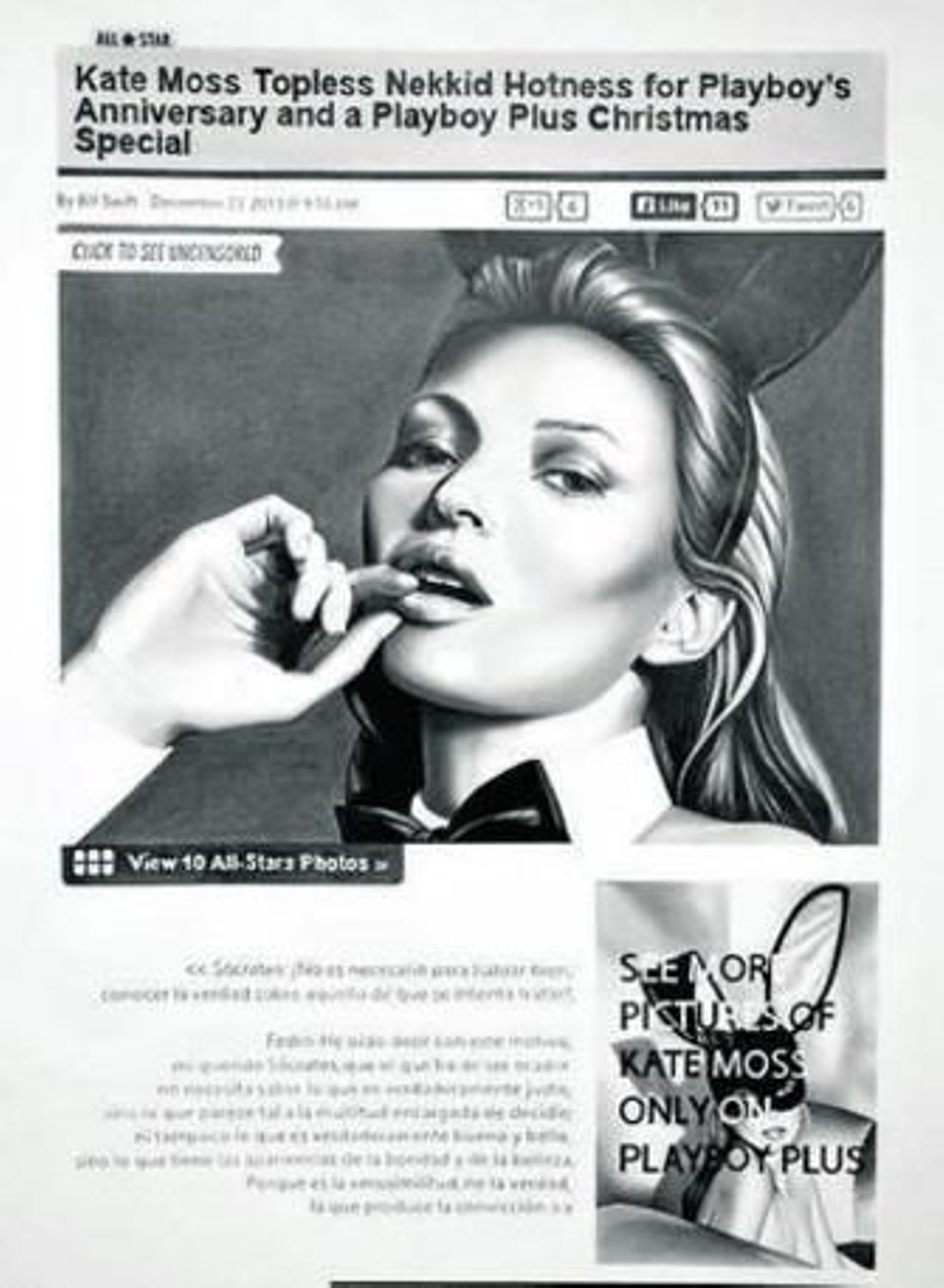 Luz Marina Baltasar (Logroño, 1981) se interesa de modo especial en los mitos sociales. Su temple reflexivo es análogo al de Julia Llerena pero lo ejercita y desarrolla mediante el dibujo. Tiempo atrás centró su reflexión en la casa, la vivienda en propiedad que, como ya señalara Sloterdijk, puede ser soñada prolongación del propio cuerpo pero también jaula que aprisiona porque aisla y porque endeuda. Los trabajos que ahora presenta se relacionan con la dudosa identidad que ofrece la publicidad. Para ello recurre al collage, el fotomontaje y la tradición pop, reinterpretándolos de modo muy personal. Toma fragmentos de anuncios, como el cubismo, pero los altera, los dobla y rasga, convirtiéndolos en fragmentos que recuerdan al fotomontaje. Esta calidad fragmentaria da a sus figuras un aspecto residual pero no queda claro si estos residuos son materiales -esto es, se han encontrado en una papelera u otro contenedor- o se han hallado desperdigados en la fantasía o la memoria. De la tradición pop recoge la quiebra de los cuerpos, característica del fetichismo publicitario, y también el juego sutil del doble: James Rosenquist llevó al lienzo un cartel donde aparecía Joan Crawford pero congeló su imagen, dándole aspecto, como icono publicitario, de figura de cera. Luz Marina Baltasar hace algo muy parecido con Kate Moss, convirtiéndola en mero estereotipo.