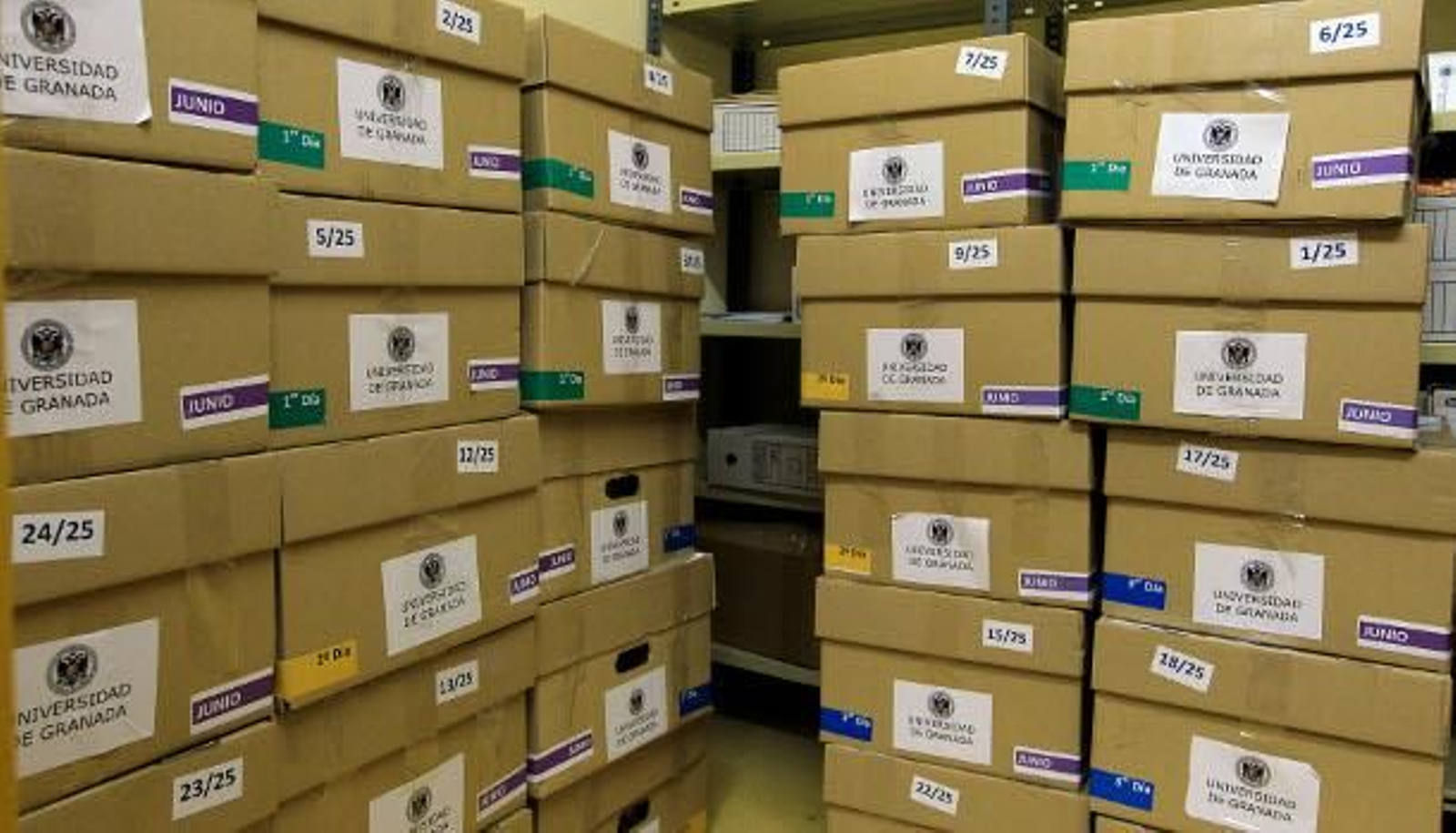 Concluida esa etapa los exámenes han sido introducido en sobres de acuerdo con las especificaciones que han realizado cada una de las universidades andaluzas. Se han armado sobres con 10, 25, 50 y 100 pruebas cada uno. “Este es un trabajo manual en el que hay que estar muy pendiente porque cualquier confusión en el número puede provocar problemas durante el desarrollo de las pruebas”. Después los sobres han sido guardados en cajas que, a su vez han sido precintadas. (En la fotografía aparecen las cajas con exámenes de la Universidad de Granada en la Selectividad de 2013).
