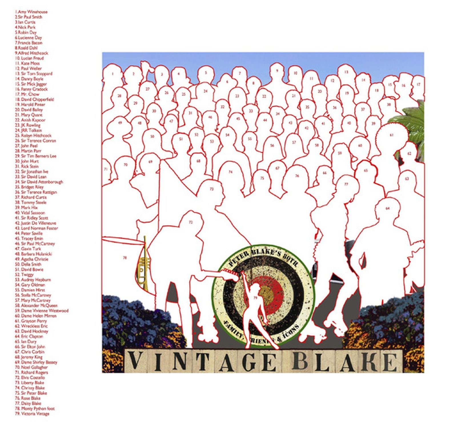 En lugar de los Beatles, aparecen en el centro de la foto Peter Blake, su mujer y sus hijas, rodeados por 73 famosos de distintas disciplinas, algunos ya fallecidos, y con los músicos Eric Clapton, Elvis Costello y Noel Gallagher, acompañados de sus guitarras, en primer plano. Entre otros han sido incluidos en el collage los cantantes Mick Jagger, Elton John, Amy Winehouse o David Bowie, la diseñadora punk Vivienne Westwood, la autora de la saga literaria Harry Potter, la modelo Kate Moss o el arquitecto Norman Foster. También los retratos de algunos personajes ya fallecidos, como la escritora Agatha Christie, la actriz Audrey Hepburn, el diseñador de moda Alexander McQueen o los pintores Lucien Freud y Francis Bacon. La obra se expondrá en el festival Vintage Wayne Hemingway, que se celebrará en Northamptonshire (centro de Inglaterra) en julio,cuando el artista cumplirá 80 años.