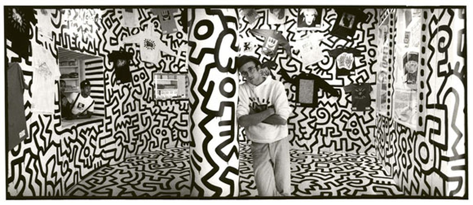 La venta de camisetas continúa dentro de la exposición, donde se ha reproducido casi fielmente la famosa tienda que con el apoyo de su amigo Warhol abrió Haring en Nueva York en 1986 y cuyas paredes, techo y suelo estaban -y están también en la Tate- totalmente cubiertas de sus famosos graffiti mientras suena un disco de música rap.