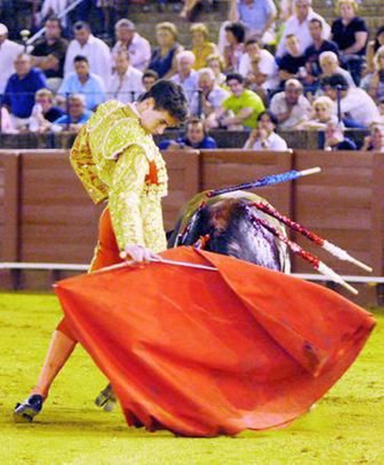 El drama aguardaba en la tercera novillada de promoción. Apenas se echó la noche sobre Sevilla, con las lentejuelas refulgiendo en la Maestranza, el segundo eral le dio con la pala del cuerno un tremendo golpe en la mandíbula a Juan Sarrión, de la Escuela de Castellón, quien cayó como si hubiera sido fulminado por un croché de Tysson. El chaval quedó inerte. El público enmudeció. Las asistencias se lo llevaron de inmediato a la enfermería. Tras varios minutos, el doctor Ramón Vila volvía a su burladero, desde donde nos comentaba que había enviado al torero al hospital Virgen del Rocío para un estudio exhaustivo, en el que no encontraron lesión alguna y fue dado de alta ayer. Con anterioridad, Sarrión se había mostrado variado en el manejo de la capa.