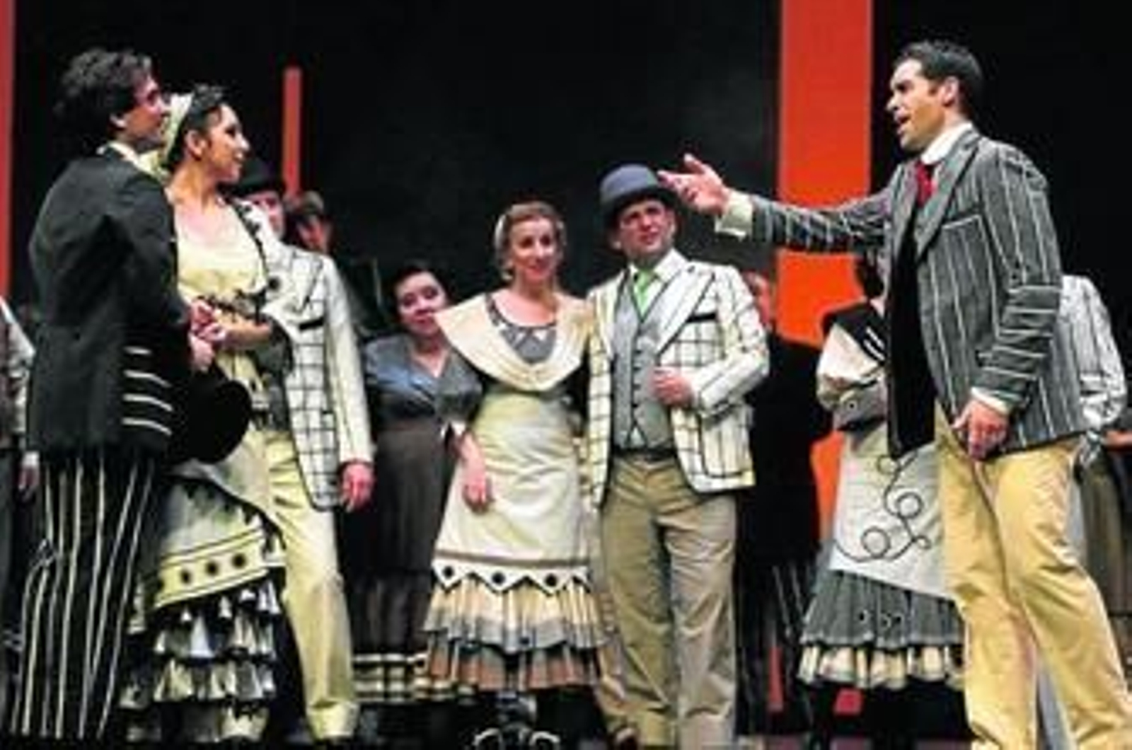 Costó en principio asimilar la propuesta escénica de Luis Olmos para un título tan denotado icónicamente como Doña Francisquita. En general, la zarzuela nace tan pegada a una realidad espacial y temporal tan acotada que resulta problemático o, cuanto menos, arriesgado, jugar a las extrapolaciones, trasposiciones y demás juegos conceptuales. Pero en este caso, tras un primer acto escueto en lo escenográfico, la visión de Olmos comienza a funcionar y a dar juego teatral desde el segundo acto. Ha optado por el esquematismo minimalista, por el juego con líneas geométricas que por medio de diagonales encontradas, van abriendo o cerrando el espacio, acotando el escenario y dando sentido al movimiento de actores. Todo ello subrayado por un magnífica iluminación que pasa de los tonos cálidos a los más fríos y que otorga volumen a las superficies. El vestuario de Engel se centra más en los años 20 que en la época romántica (canotiers por chisteras), con gran profusión de texturas y coloridos.