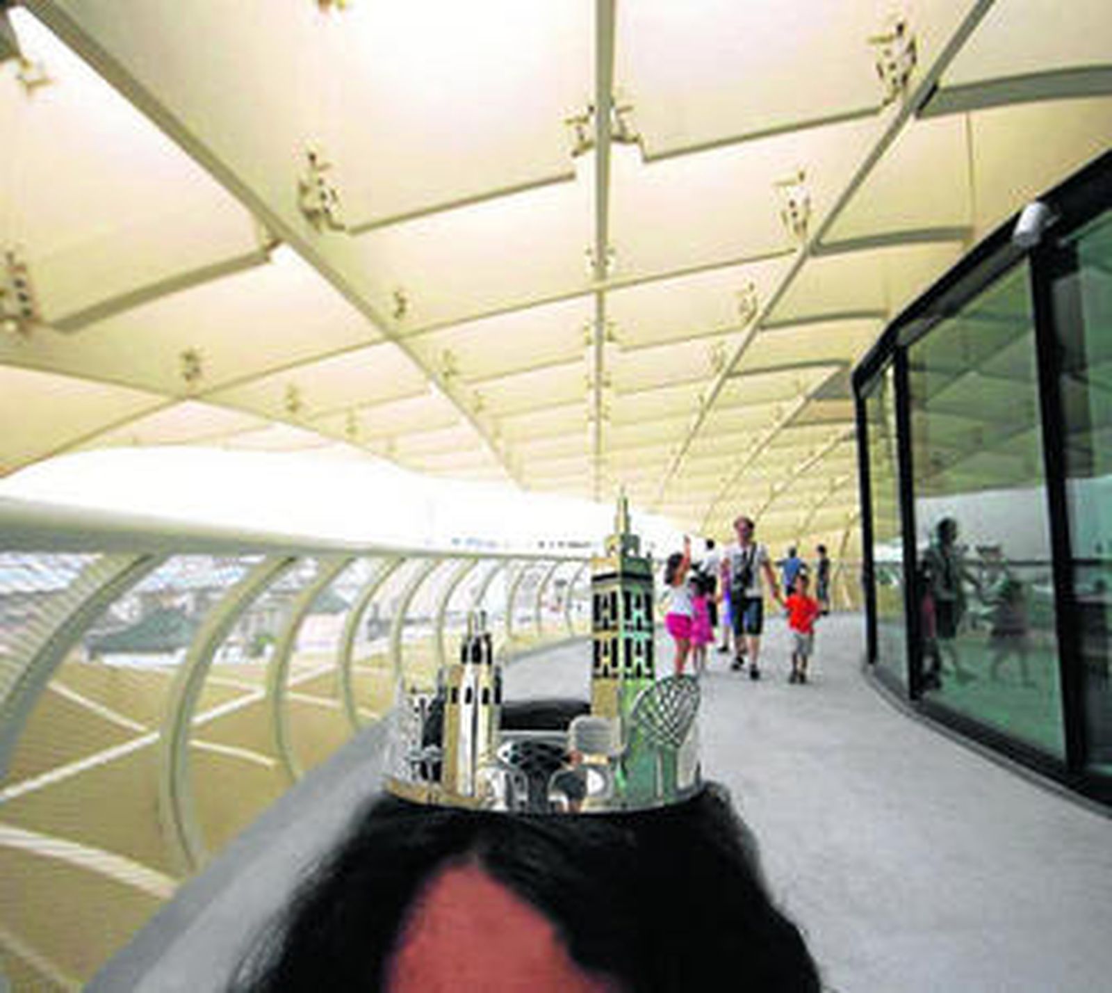 La inquieta Julie Rivera (Jerez, 1975) recorre el camino que media entre la azotea del hotel Eme y las cubiertas del Metropol Parasol portando una corona de metacrilato y plata entre cuyas diademas aparecen maquetas en miniatura de la Giralda y otros hitos arquitectónicos de Sevilla. Esta performance, grabada en vídeo, forma parte de la muestra La arquitectura de la felicidad, "una crítica a la banalización de los cascos históricos por la presión turística y a la estandarización del ocio", según su comisaria Margarita de Aizpuru. La de Rivera es una de las tres exposiciones que hoy se inauguran a las 20:00 en el Centro Andaluz de Arte Contemporáneo (CAAC) como parte de su sesión expositiva Margen y ciudad. Las otras dos son Tu país no existe, de la pareja artística Libia Castro y Ólafur Ólafsson, que representaron a Islandia en la última edición de la Bienal de Venecia, así como la colectiva A las ciudades se las conoce como a las personas, en el andar.