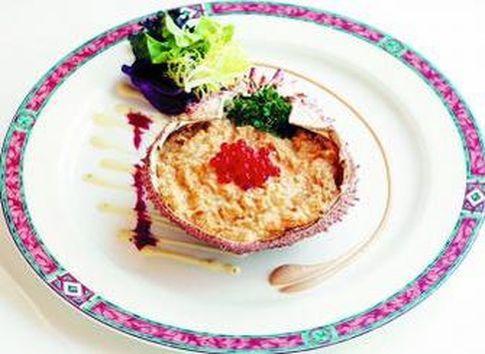 l Servir en sus propias conchas, decorado con huevas de salmón.