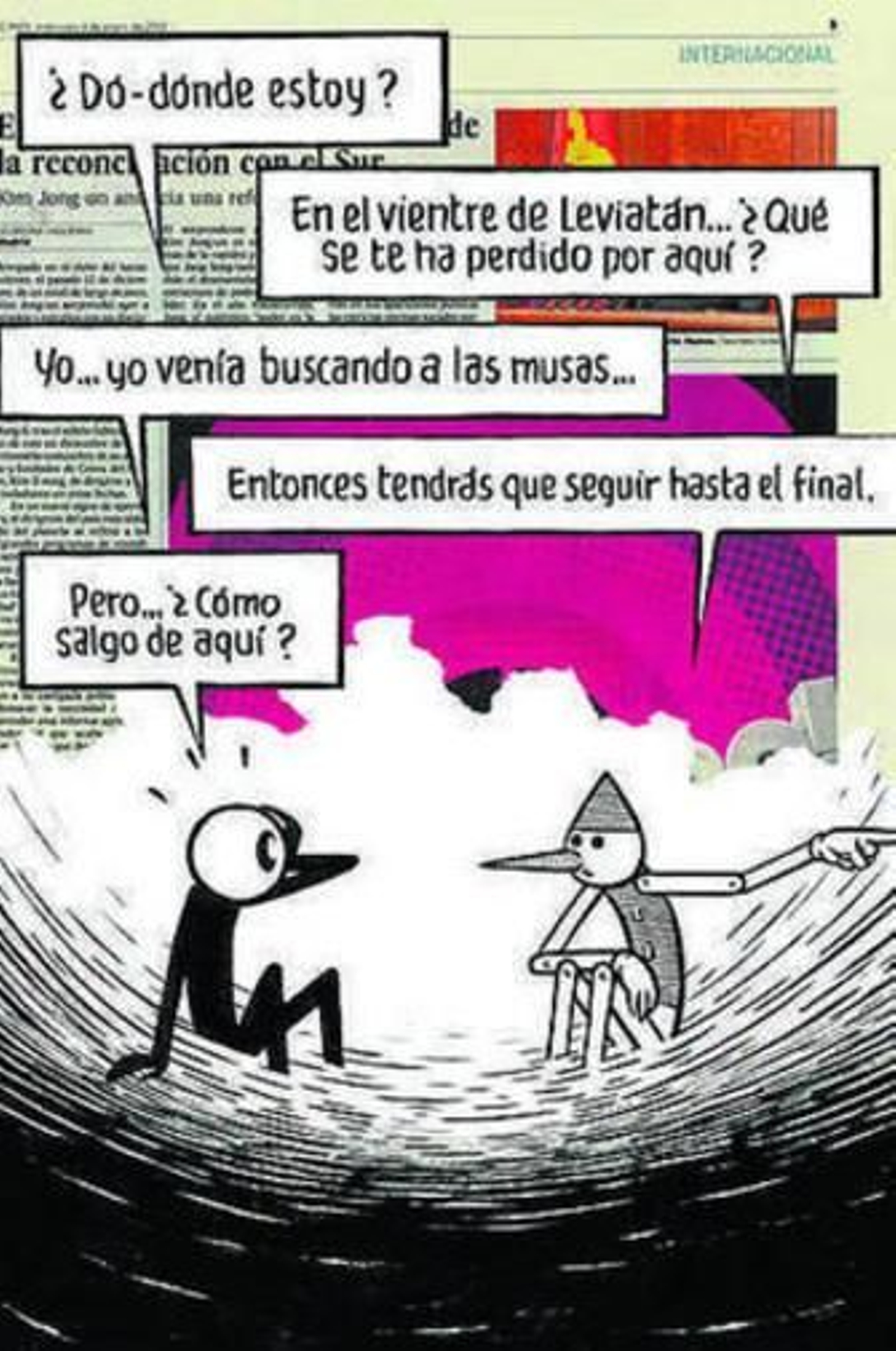 Además de las 46 splash pages ya mencionadas, el libro se completa con la reproducción de un sugestivo mural dibujado también por el artista y de los thumbnails previos a la realización de esta peculiar historieta, más una lámina de regalo. Recomiendo la visita al blog del dibujante, donde se puede disfrutar de varias fotografías de la instalación del material en ARCO, así como de los comentarios por parte del propio autor, diseminados a lo largo de diferentes entradas del mismo.