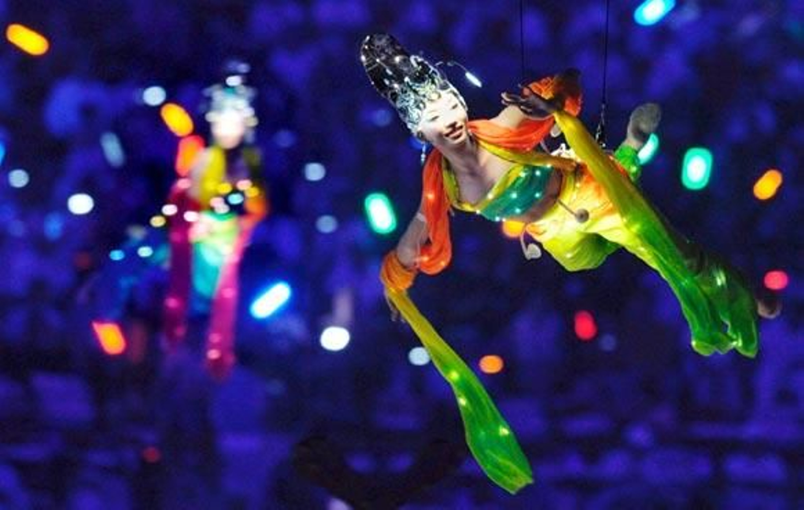La ceremonia dio paso a una impactante serie de representaciones de la cultura china. Una proyección simuló la apertura de un pergamino sobre el que unos bailarines simulaban el sumi-e, técnica de dibujo monocromático de origen japonés e introducida en China hacia el año 700, con una serie de movimientos de gran plasticidad, a los que siguieron alegorías a los grandes hitos de su historia, como la imprenta, la brújula, la porcelana, la Gran Muralla, la Ruta de la Seda, los guerreros de terracota, Confucio, el tai-chi o la ópera china.