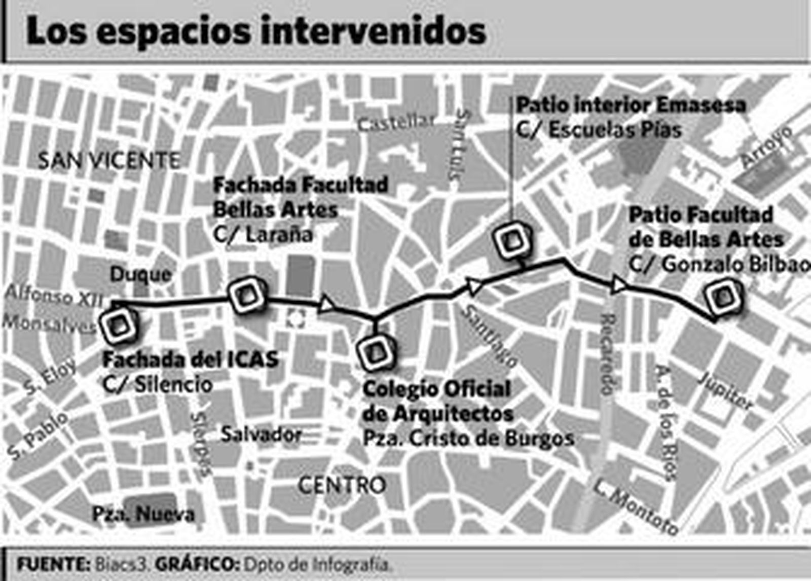 La sede del Instituto de la Cultura y las Artes de Sevilla (ICAS), en pleno centro, ofrece desde ayer una estética insospechada gracias a varios carteles de Se vende. El cambio no responde a ninguna operación inmobiliaria: es parte del proyecto de Fernando Claro Guerrero y Javier Martínez Navarro Daily Art, una de las cinco iniciativas galardonadas en el concurso Transversal Biacs sobre intervenciones artísticas en lugares públicos.