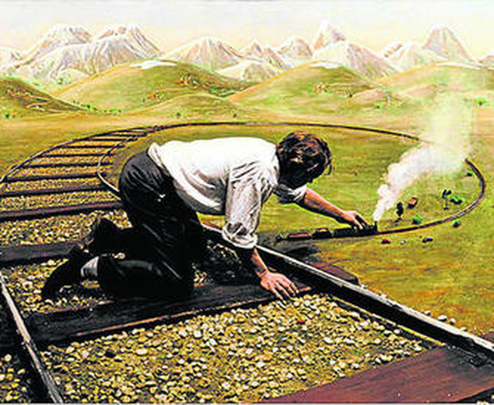 En la obra de Teun Hocks, un hombre, quizá el propio autor, a la izquierda de la imagen, pone sobre un raíl una locomotora, por su tamaño, un juguete. El raíl se dirige hacia la derecha pero describe enseguida una gran curva, pasa al pie de las montañas del fondo y vuelve, convertido en verdadero camino de hierro, al punto de partida, al lugar donde el autor iniciaba su peculiar juego.