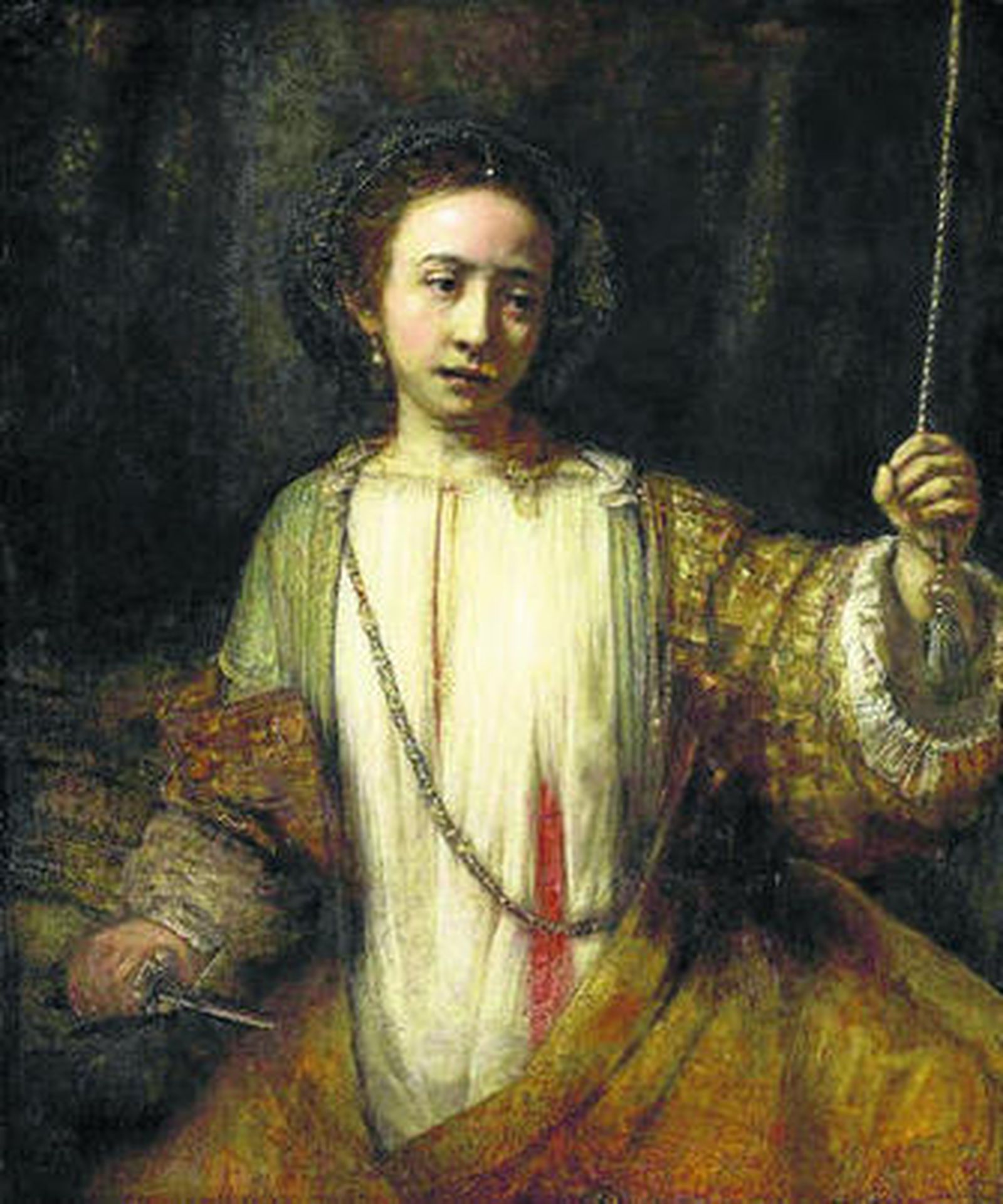 Muchas de sus creaciones finales representan un conflicto interior suscitado por la búsqueda de un imposible equilibro entre pasiones que devoran y sentimientos contrarios. Así ocurre con la hermosa Lucrecia (1666) del Instituto de Arte de Minneapolis, que encuentra en el suicidio la única escapatoria moral a la insoportable vergüenza de su violación. El innato deseo de vivir y la tristeza desgarrada del rostro que se despide del mundo con el gesto de llamar con la campana a su familia nos conmueven mientras reparamos con horror en la sangre que asoma ya por el camisón. Rembrandt se vuelve más matérico que nunca, llegando a hacer incisiones, a acuchillar la pasta pictórica, abriendo el camino que transitarían siglos después artistas como Francis Bacon.