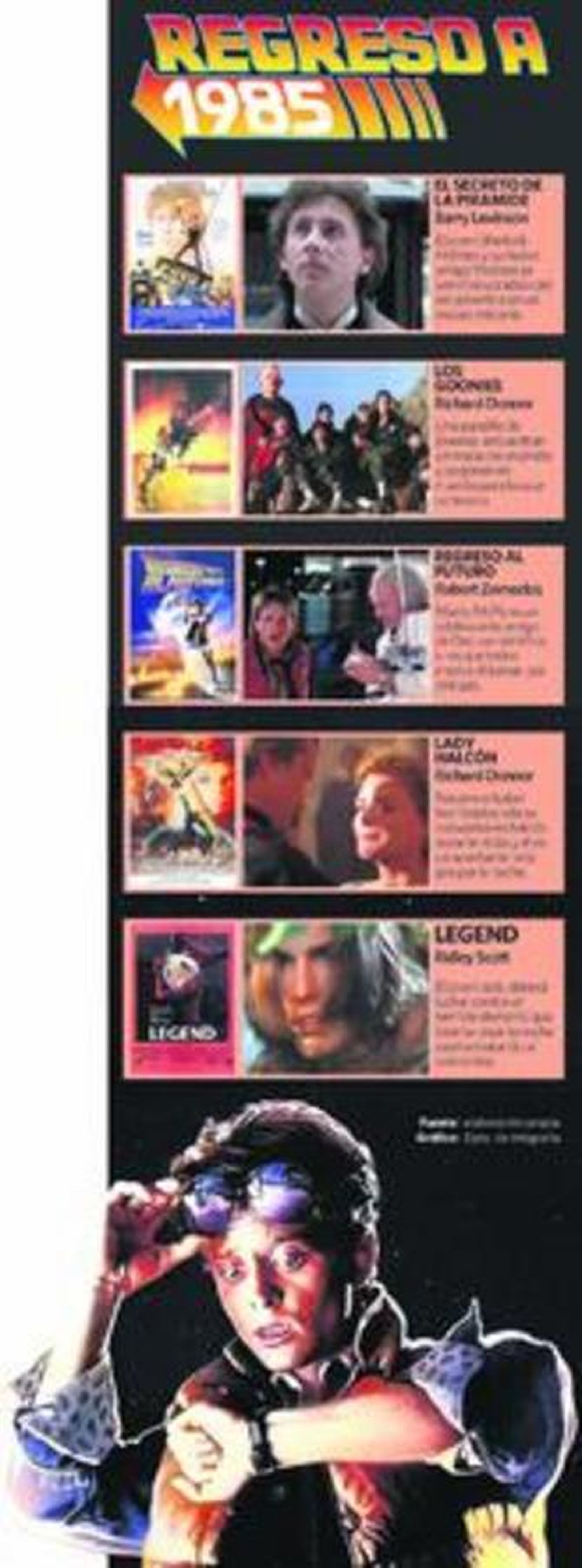 El condensador de fluzo. Las cerbatanas venenosas en el Londres victoriano. Los peligros del agua a partir de medianoche. Los succionadores de ectoplasma. La noche sin día y el día sin noche. Todos ellos son conceptos comunes para las generaciones que vivieron su infancia y adolescencia a mitad de los ochenta y -gracias al revival retro- para muchos de los que llegaron después. Hace veinticinco años vieron la luz títulos como Legend, Lady Halcón, El secreto de la pirámide, Los Goonies o Los inmortales. Películas que han pasado a vertebrar gran parte del imaginario colectivo: "Fueron dos veranos en los que prácticamente se estrenaron todos los títulos de este tipo. El del 84 también fue muy fuerte, con El templo maldito, Terminator, Gremlings... -comenta al respecto Paco Fox, programador de cine en Canal Plus y uno de los gestores del blog Vicisitud y Sordidez-. Y era todo por el reinado de la Amblin, la productora de Spielberg, que consiguió llevar a su máxima expresión el cine de entretenimiento familiar. Incluso los títulos en los que él no tenía que ver, como la tercera de Mad Max, estaban también muy influidos por su manera de hacer las cosas".