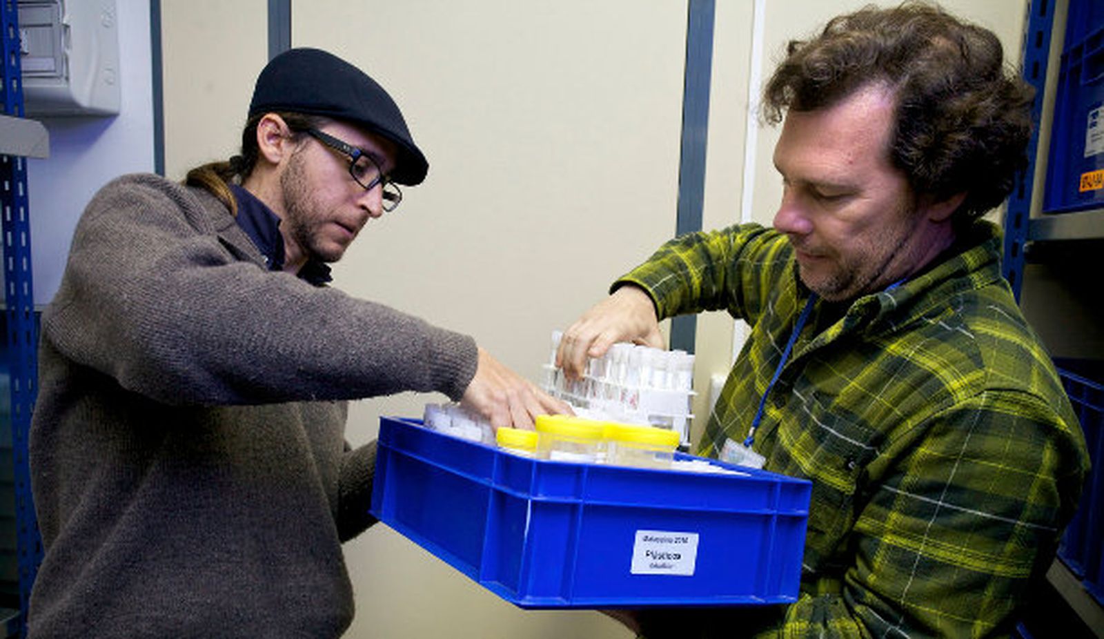 Los investigadores gaditanos Andrés Cózar (izda.) y Juan Ignacion González Gordillo con unas muestras.