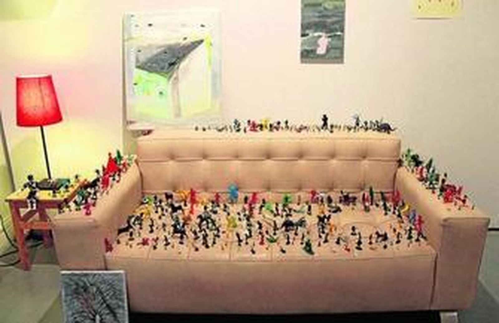 Entre las escenificaciones de los diferentes estudios hay quien ha trasladado por completo su taller al edificio de la Avenida María Luisa, como Luz Marina Baltasar, "que ha vaciado la habitación que utiliza habitualmente y ahora está aprovechando para pintarla, se lo ha traído todo", cuenta D'Acosta. "Otro tiene que venir de vez en cuando a recoger pinceles o pinturas; Gloria Martín está ahora mismo en Bélgica, porque es la que ha ganado la beca Sevilla es talento, y tiene aquí su lugar de trabajo tal cual", prosigue el comisario. El caso contrario es el de José Carlos Naranjo, que "tiene una exposición en Cádiz y no podíamos dejarlo desasistido". Una de las escenas más llamativas que brinda el recorrido por Lugar de trabajo es el pequeño apartamento que ha dispuesto Fernando Sáez, con su mesa, la jaula con el canario... y un sofá que se presenta tomado por pequeñas figuras de juguete. "Él tenía esa reminiscencia de cuando era pequeño y repartía muñequitos por su habitación. En un principio nos parecía poco creíble, pero él lo sigue haciendo, repartir los muñequitos, porque dice que eso le inspira".