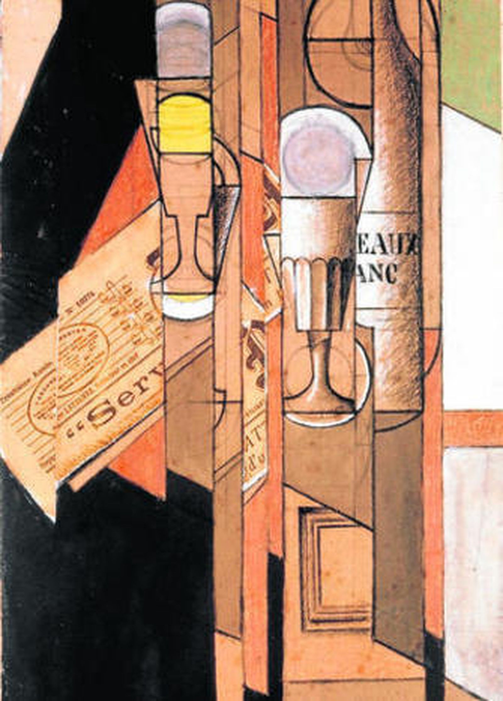 El cuadro que abre la muestra es casi un manifiesto. Juan Gris, que ese mismo año, 1913, logra un contrato con Kahnweiler que le da paz económica, reúne en Vaso, diario y botella de vino muchos hallazgos del cubismo. Con exactitud, articula el collage, distribuye los planos, fragmenta los objetos y alterna con precisión dos técnicas, gouache y carboncillo. Es una obra antológica, buen punto de partida para iniciarse en la vanguardia más decisiva, el cubismo.