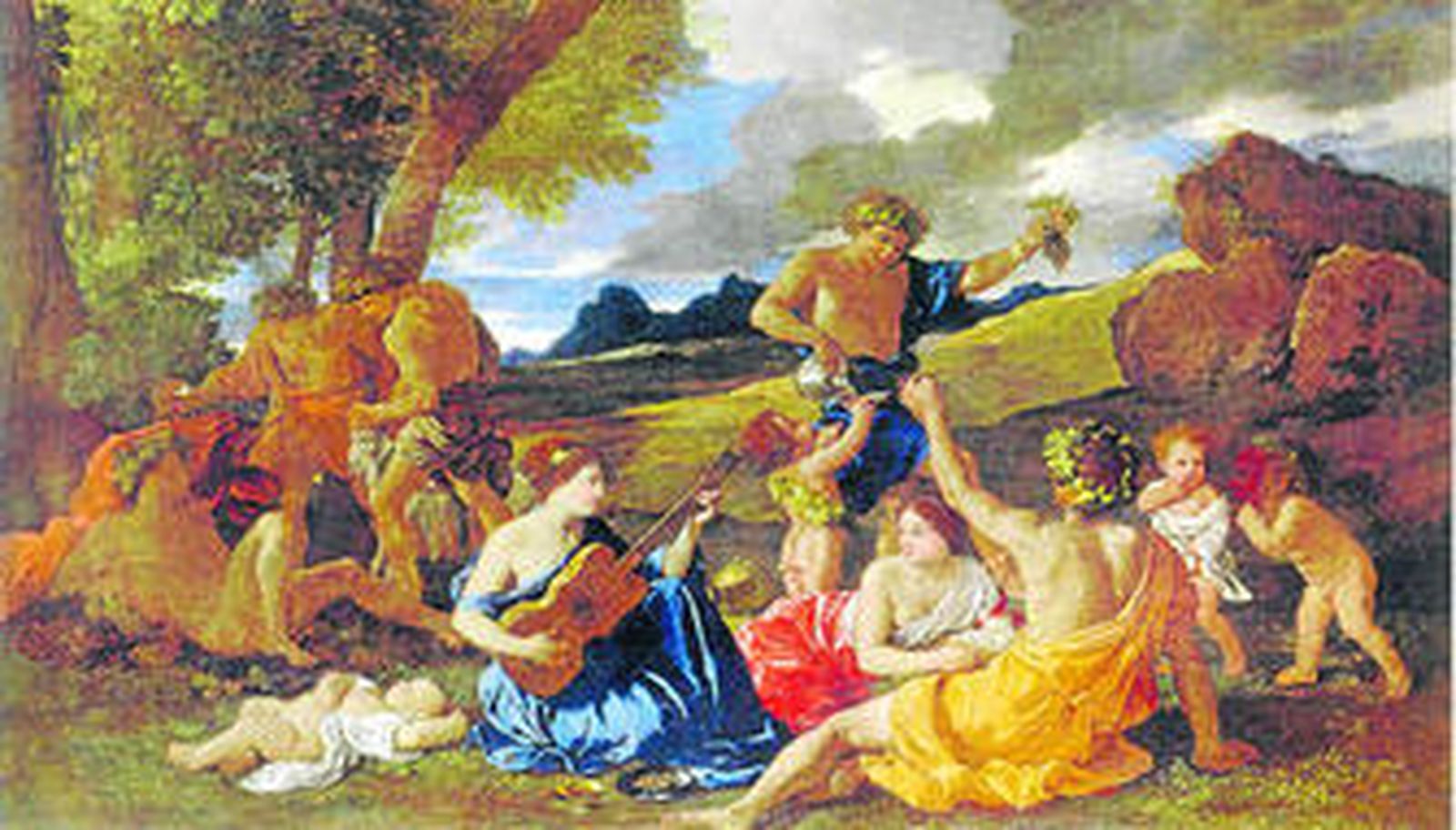 En esa misma sala aparecen ya obras de Poussin. Francés de nacimiento, logra establecerse en Roma a los treinta años, ciudad en la que fallecería en 1665 a los setenta y uno. Tampoco fue un artista precoz pero desde la segunda mitad del siglo XVII se convierte en punto de referencia para los tratadistas franceses del clasicismo. Los cuadros expuestos pertenecen a la primera época del autor, la que Anthony Blunt (el historiador y crítico británico que fue acusado de espionaje) califica de heroica. La estructura de las obras difiere de las de Claudio de Lorena (de quien era buen amigo): en ellas juegan papel decisivo el trazado perspectivo y la ordenación por planos paralelos. También es diferente el tratamiento del color.