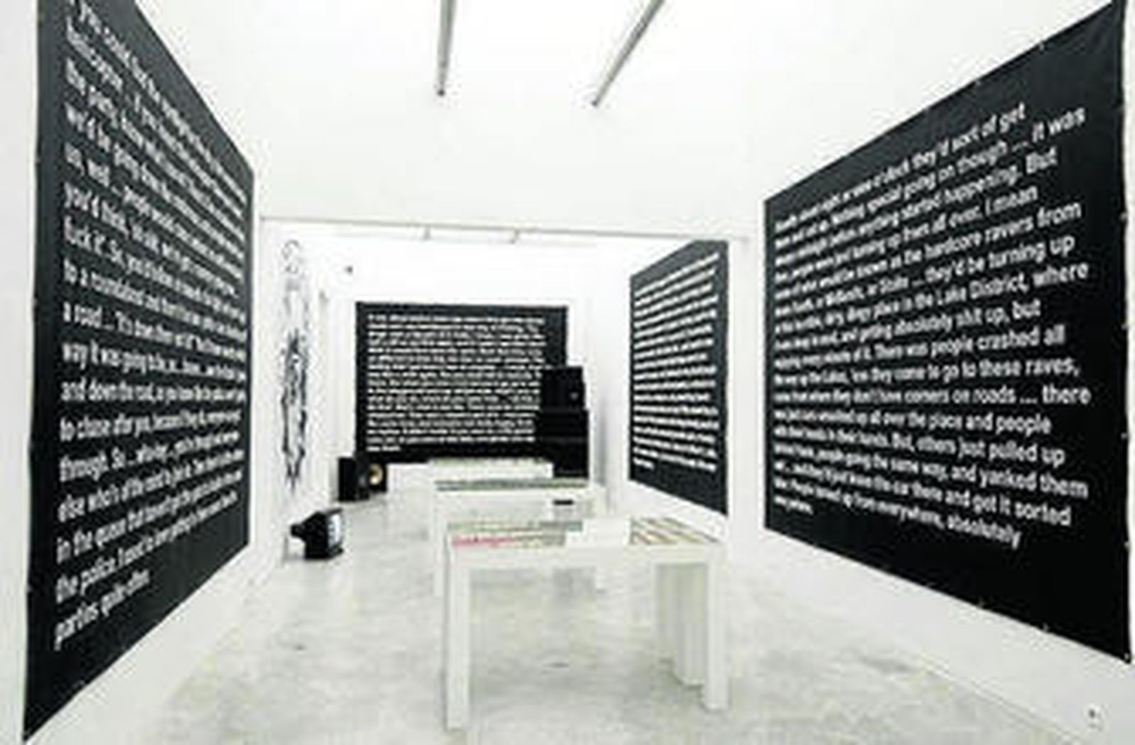 Estos signos de nuestro tiempo los trata Matt Stokes en clave británica. Interesa su compilación de documentos de las fiestas rave, bailes clandestinos que, ante las restricciones del gobierno Thatcher, se multiplicaron hace 25 años en Gran Bretaña (hoy se celebran en la zona metropolitana de Madrid) ocupando fábricas y talleres abandonados e incluso cuevas. Stokes reúne carteles, cassettes, banderolas con narraciones de los ravers, fotos de los recintos y unos vídeos donde la policía expone su trabajo de vigilancia. No falta la alusión a un género decisivo en la cultura anglosajona, la balada, convertida hoy en canción folk. Stokes la propone a través de un vídeo que une preciosismo e ironía. El joven bombero, héroe a su pesar, será de mayor artesano, constructor de violines, instrumento típico del género. La pausada narración contrasta con la potencia vocal de Sonata Profana con que culmina la muestra.