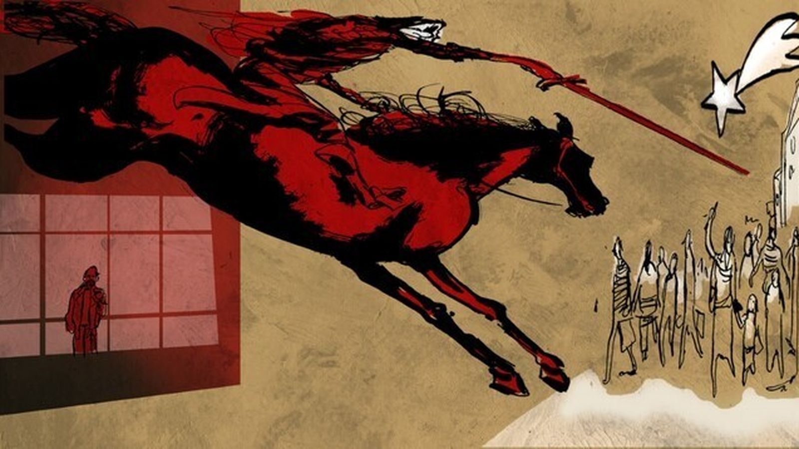Finalmente… se detuvo a pensar atribulado el Extraño… estamos en el ahora. Cuando creíamos que los hombres ya no podían aguantar más, y que se debía imponer el espíritu colaborativo, hizo su aparición el caballo rojo del Apocalipsis tras la Navidad del año pasado. Como en las películas de Bergman sobre la guerra medieval, se presentaron, sin ser requeridos, los Amos de la Guerra. Todos, unos y otros, necesitaban imperativamente que corriese la sangre para engrasar la gran máquina. Había llegado El Tiempo del Gran Moloch. Los Amos hablaron de operaciones quirúrgicas de pronto fin, como siempre, y luego las convirtieron en eternas, como siempre. Llegado a ese punto de su explicación, estando Cándido asombrado y balbuciente, el Extraño prorrumpió a gimotear.