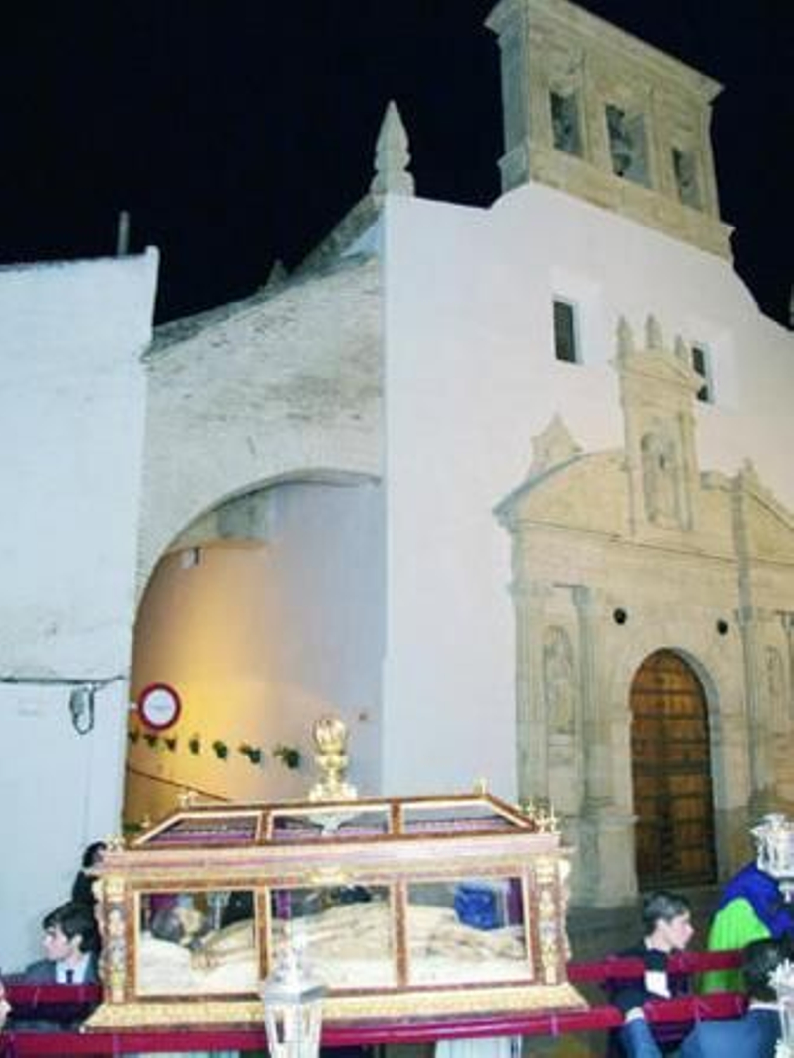 El luminoso Patio de los Naranjos de la parroquia de la Oliva se convertirá hoy en una lúgubre estancia donde los lebrijanos mostrarán sus respetos al Cristo Yacente, una antiquísima talla de mediados del siglo XIV que, ubicado en su urna, preside el patio. Una imagen única, la velación del entierro de Jesús, a la que también acude la Virgen de la Soledad, escenificada como madre de Cristo y depositaria de las condolencias de sus vecinos.