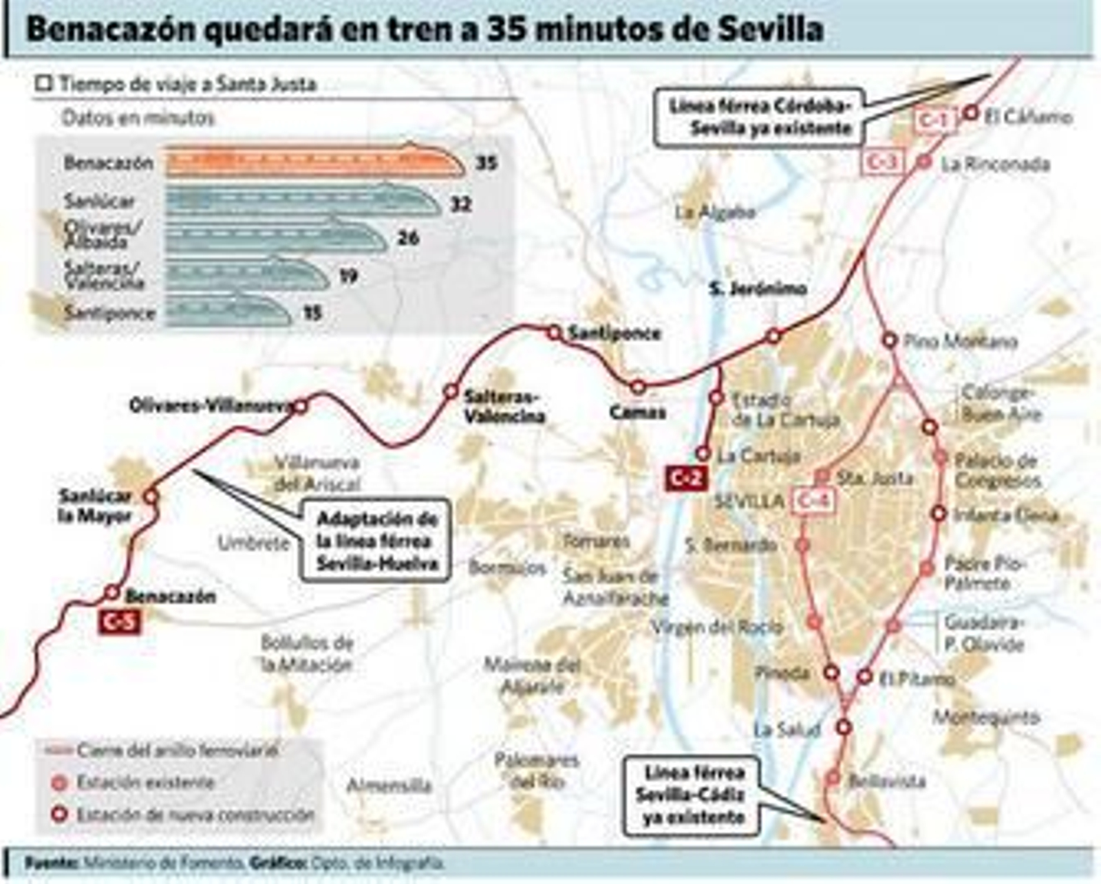 El proyecto que ha salido a concurso prevé adaptar la línea férrea existente Sevilla-Huelva al tráfico de Cercanías hasta Benacazón desde la bifurcación de la capital y ampliar el Cercanías hasta la isla de la Cartuja duplicando la vía. El PSOE sevillano espera que Fomento conceda ocho millones de euros para 2009.