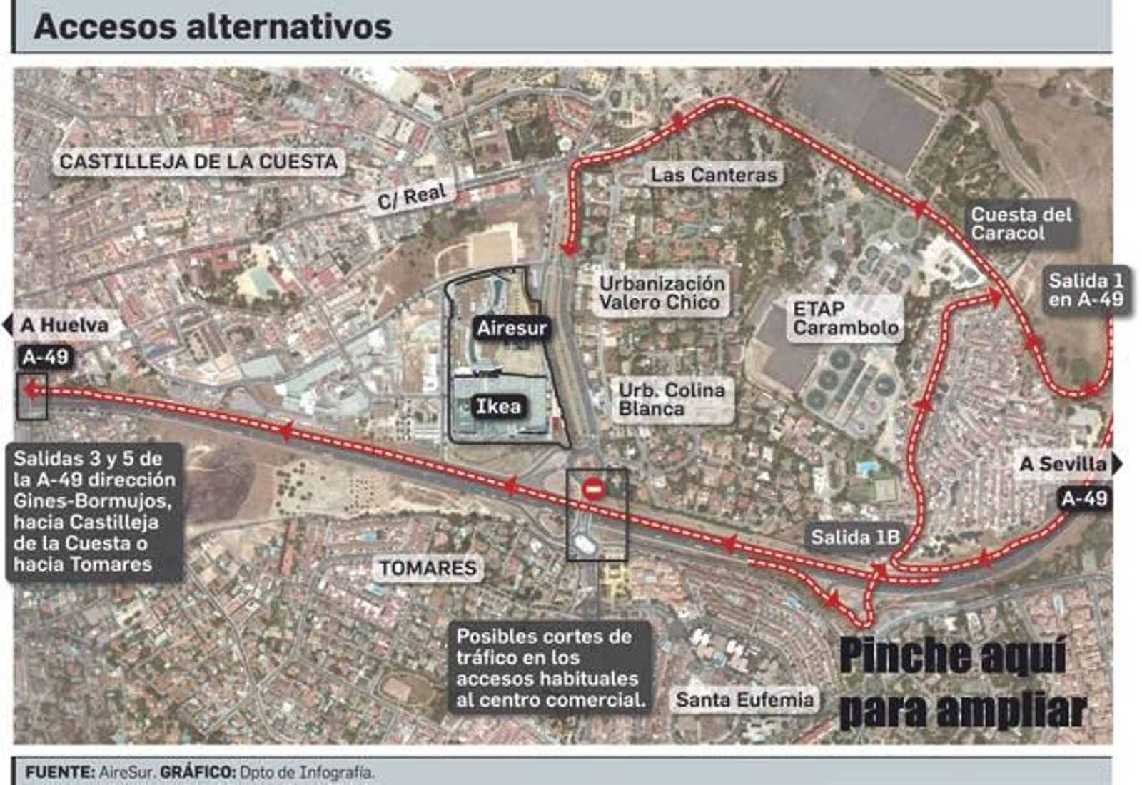 El centro comercial AireSur, siguiendo las indicaciones de la Dirección General de Tráfico, la Policía Local y del Ayuntamiento de Castilleja de la Cuesta, ha informado de las medidas especiales de circulación que se llevarán a cabo en los accesos al centro comercial AireSur e Ikea este próximo martes, un dispositivo especial de tráfico con el objetivo de "facilitar el acceso por carretera a la zona comercial debido a la gran afluencia de personas que se espera para este martes, 8 de septiembre, festivo en muchos municipios de la zona".