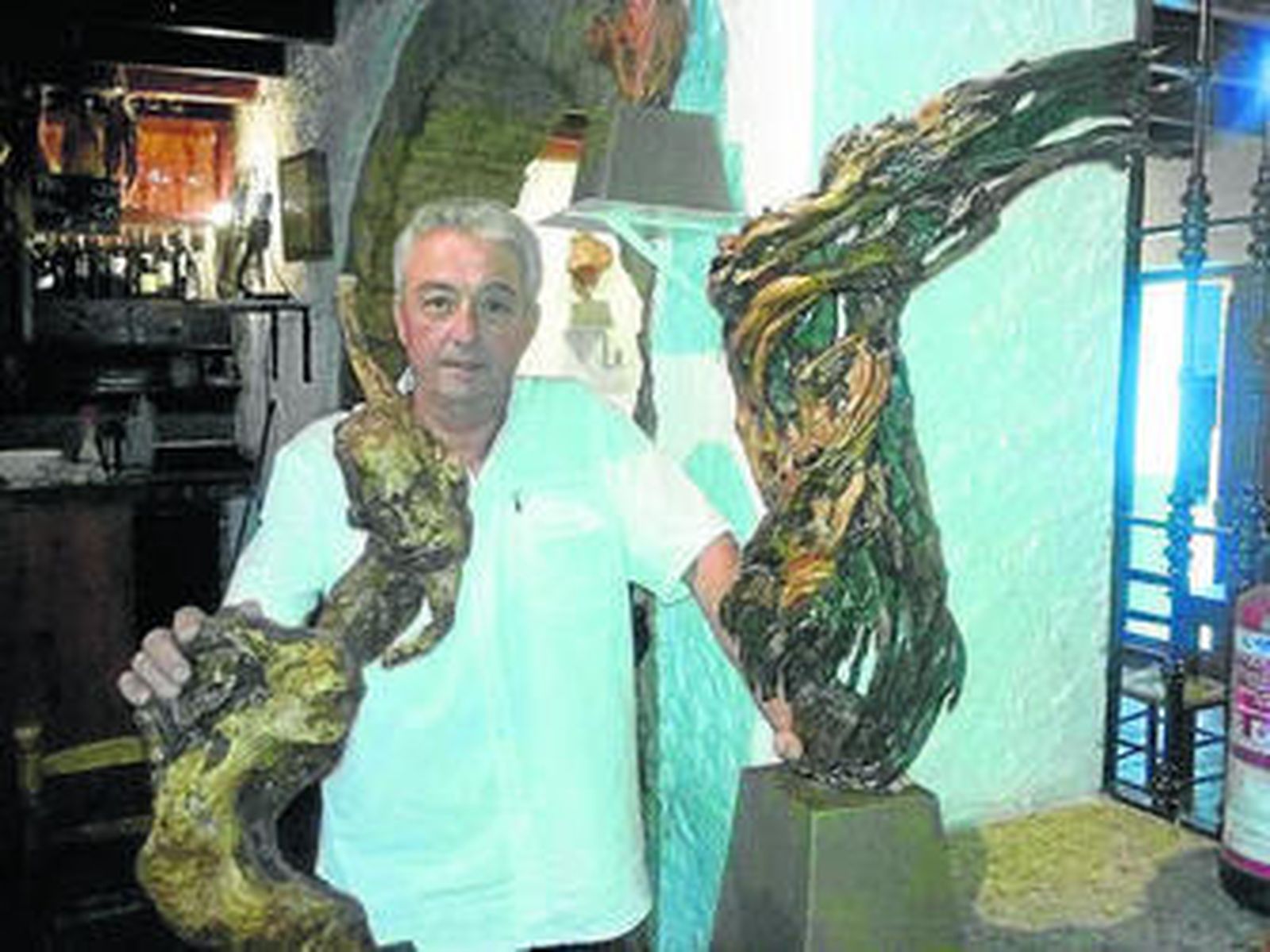 Madera viva. El escultor y dueño de la taberna La Bomba, Juan Fernández Mayo, lleva más de 30 años tallando obras de arte religiosas, mitológicas y literarias y ya ha expuesto en varios países.