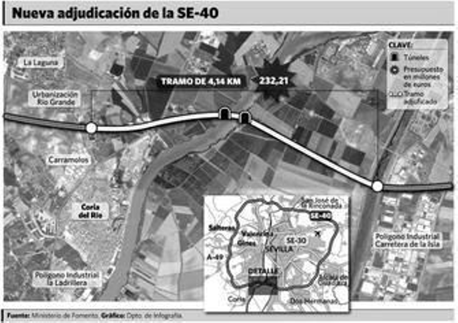 El presupuesto de adjudicación, según un comunicado del Ministerio de Fomento, asciende a 232.205.011 euros y el plazo estimado para la ejecución de las obras es de 40 meses. El objeto de las obras es la construcción del tramo "Dos Hermanas (A-4)-Coria del Río (A-8058). Subtramo: Enlace A-4 (Dos Hermanas)-Túneles Sur del Guadalquivir- Embocadura Oeste" perteneciente a la Circunvalación del Área Metropolitana de Sevilla SE-40. Esta nueva arteria de circunvalación se plantea alejada de los núcleos urbanos del entorno inmediato de la capital y con una perspectiva de futuro que evite los problemas de saturación de la SE-30.