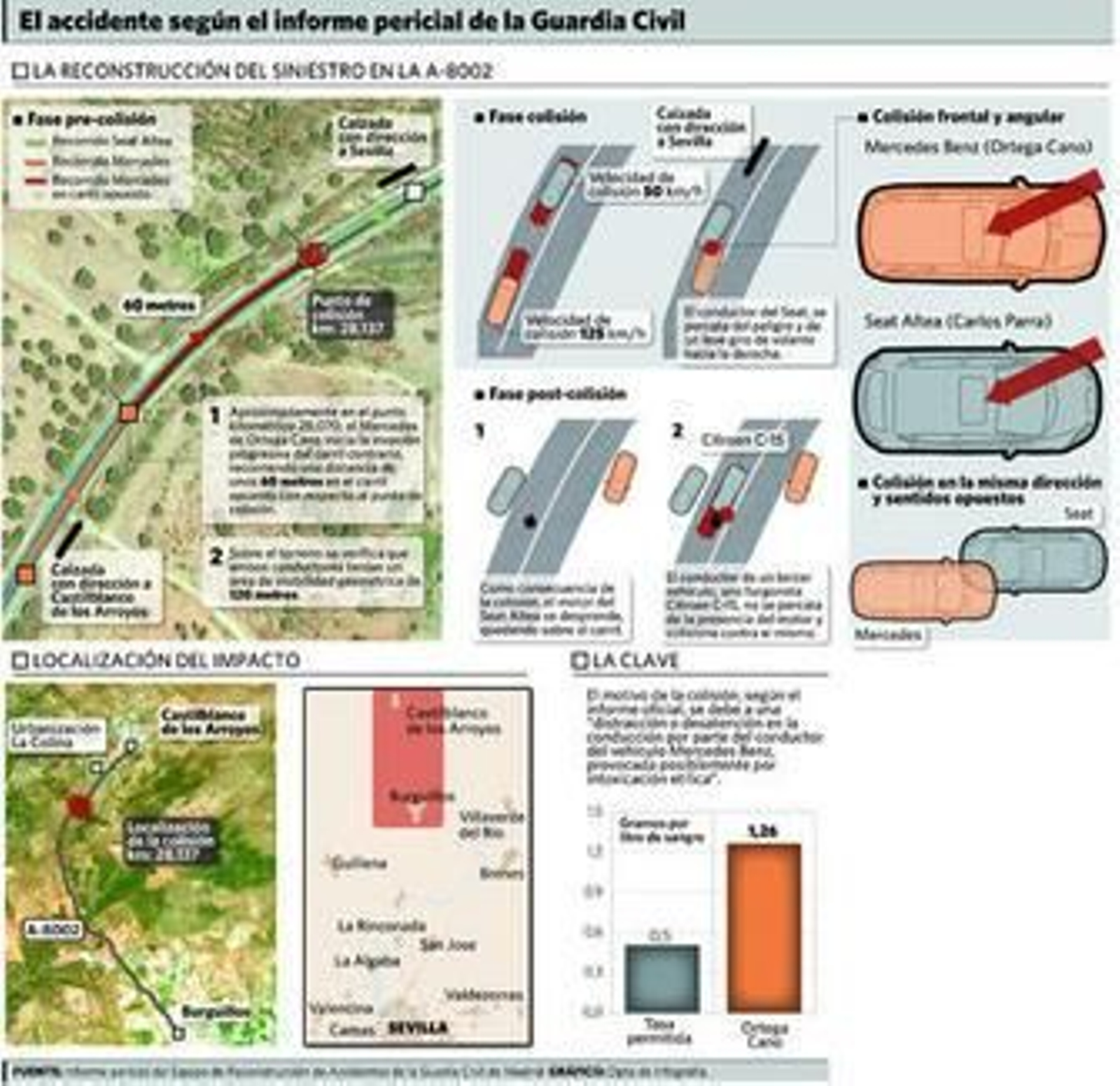Entre las principales conclusiones, los peritos destacan que el vehículo de Ortega Cano invadió el carril de sentido contrario al de su marcha durante al menos unos 60 metros antes de la colisión y que en ese momento circulaba a una velocidad aproximada de 125 kilómetros por hora, un nivel superior al legalmente permitido en esa vía y que era de 90 kilómetros por hora. Por su parte, el vehículo que conducía la víctima, Carlos Parra, circulaba a unos 50 kilómetros por hora.