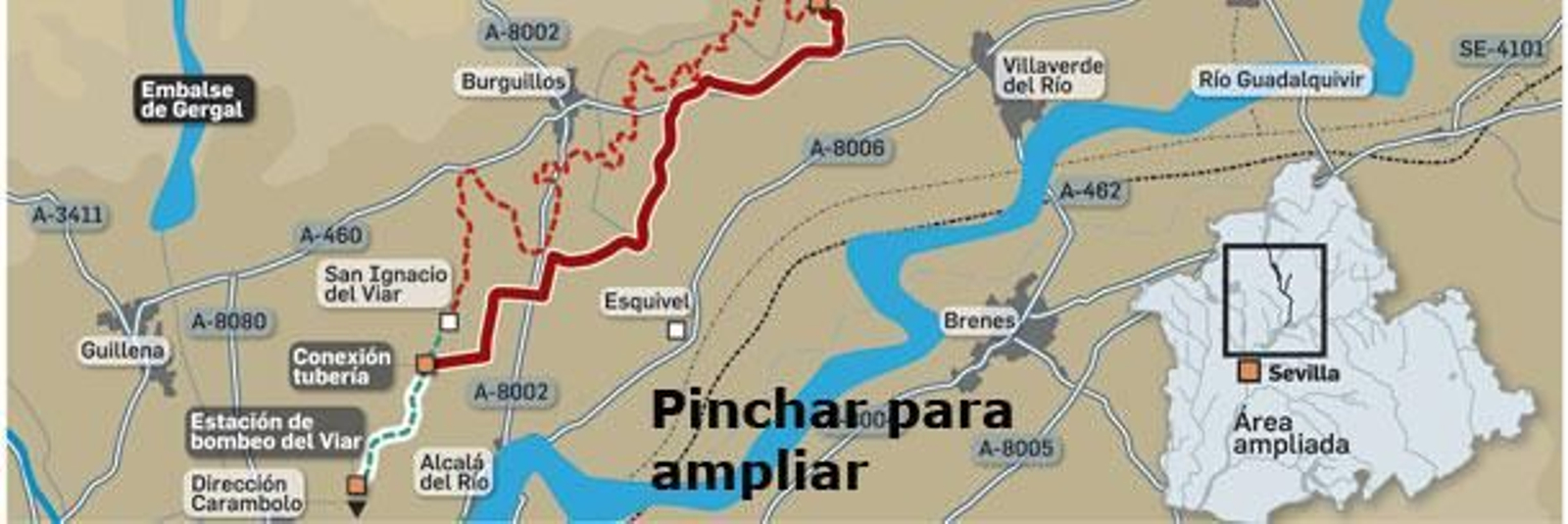Desde el pantano de Melonares, situado en la Sierra Norte de Sevilla hasta su llegada a la estación de tratamiento del Carambolo, en Camas, las aguas recorren 62 kilómetros. Discurren en un primer tramo por el actual canal de riego del Viar (rehabilitado) hasta llegar a la balsa de regulación, con una capacidad de 167.000 metros cúbicos, de la que parte la nueva conducción de 13 kilómetros, que conecta con las ya existentes que se realizaron con motivo de la sequía, hasta su entronque final con las conducciones del Gergal-Carambolo.