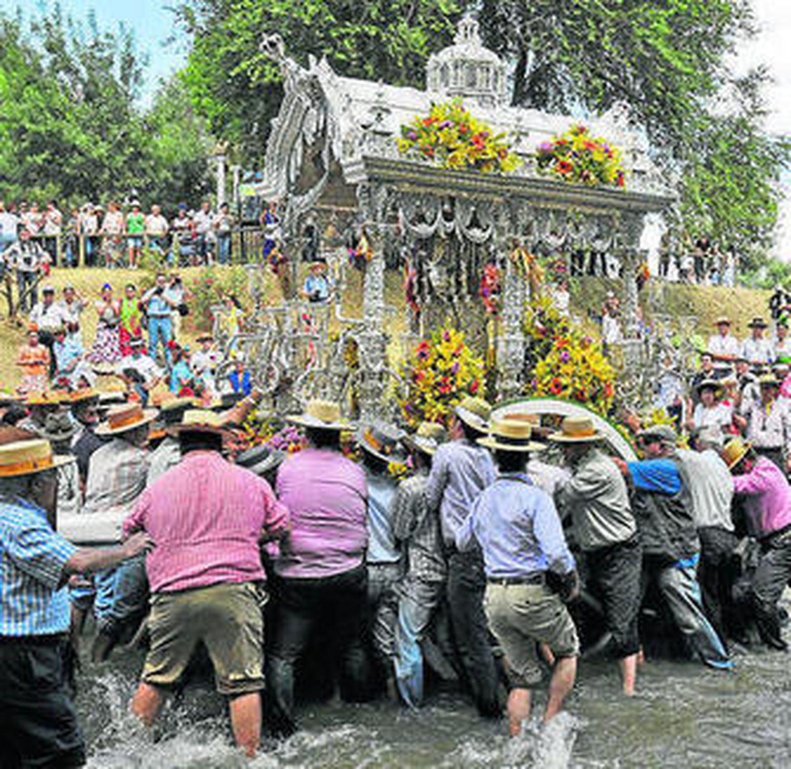 Del Quema a la Raya Real. Sevilla en las aguas y Triana en las arenas. Una ciudad en peregrinación por matorrales y pinos. Despierta pronto la jornada en el Guadiamar. Último día de carretas por un vado que le ha robado el nombre al río. Después quedará la vuelta, pero ésa es ya otra historia, muy distinta a la que ahora protagonizan hermandades como Osuna y Puente Genil. En la primera su director espiritual llama a los peregrinos a la oración subido en un charré convertido en púlpito. En sus labios una plegaria y en sus pies una nevera con las viandas justas y necesarias para continuar el camino. Hay que reconfortar el espíritu y el estómago cuando a las doce de la mañana el hambre empieza a clamar.