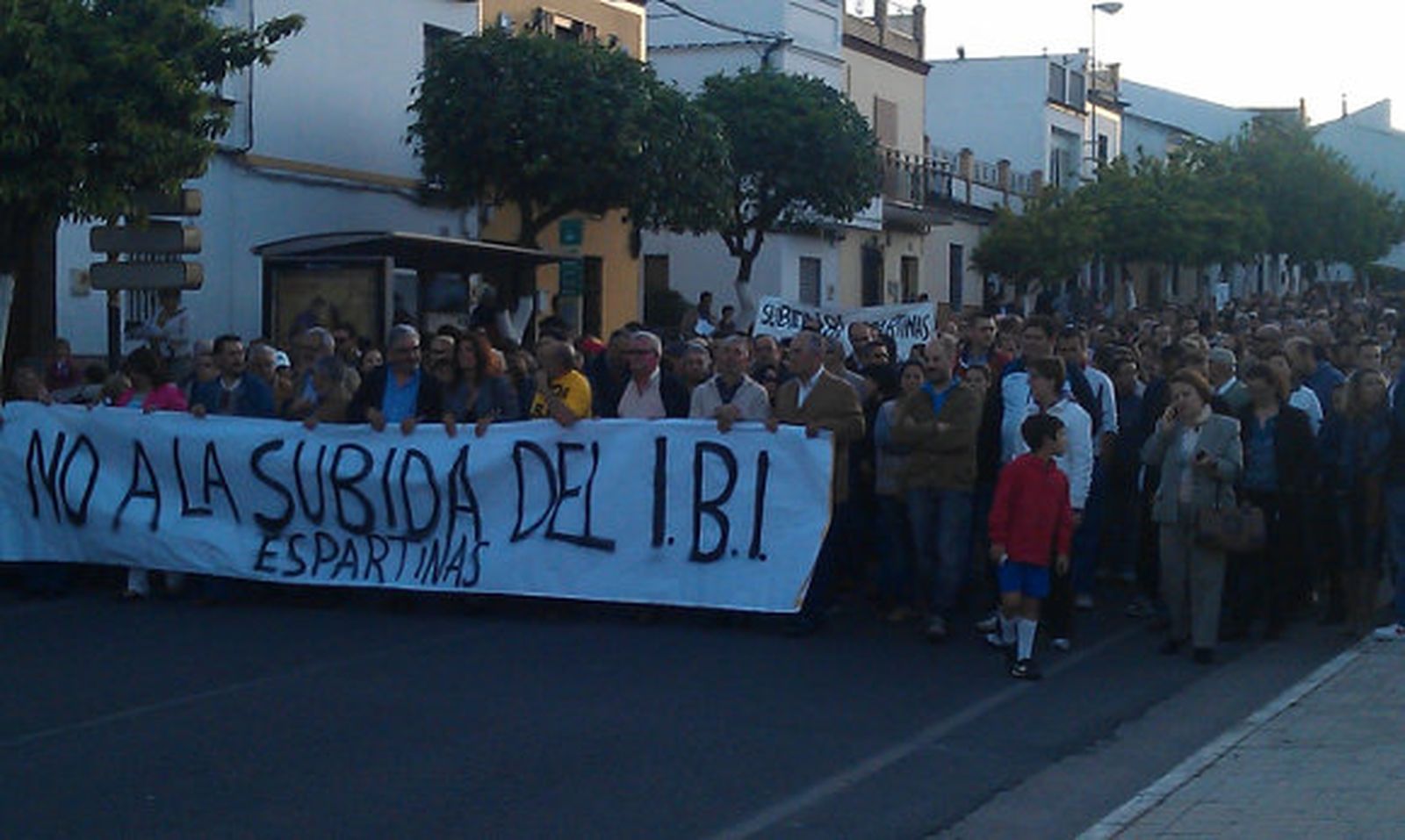Más de un millar de personas según los organizadores, unas 500 según el gobierno local, se manifestaron ayer por las calles de Espartinas contra la subida de más del 80% con respecto a 2011 del Impuesto de Bienes Inmuebles (IBI). La marcha estaba convocada por los grupos de la oposición PSOE, PA, IU y UPyD.