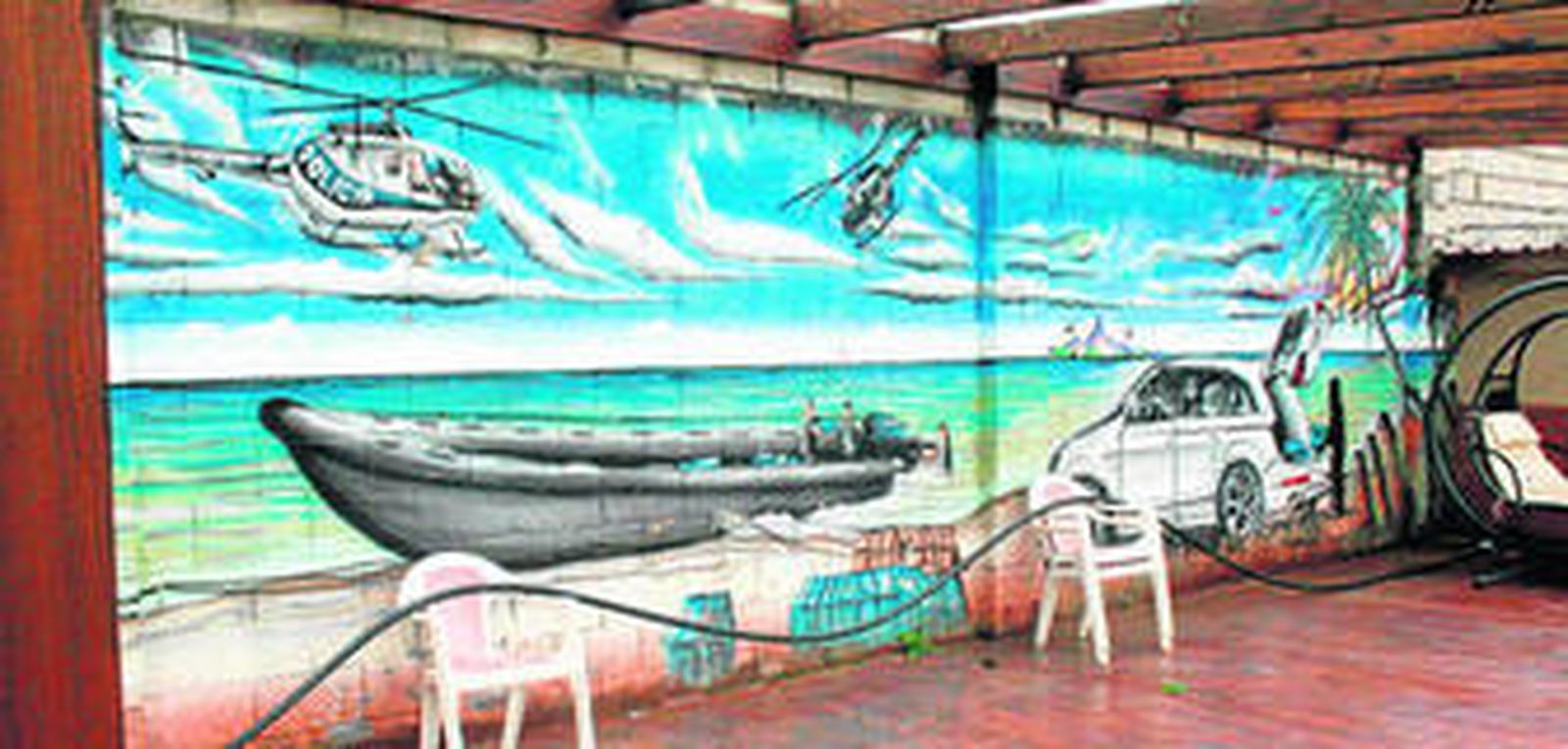 Ninguno de los policías que registró el chalé de Carmona en el que vivía uno de los implicados en el robo de droga en la aduana de Huelva podía imaginarse lo que se iba en encontrar allí. Podían suponer que encontrarían una caja fuerte, como hallaron; que habría dinero en metálico y joyas de gran valor, como así fue; o que incluso darían con una máquina utilizada para contar billetes, prueba de que allí el manejo de cantidades ingentes de dinero era frecuente. Pero ninguno podía suponer que encontrarían un auténtico fresco en el que se representaba todo un alijo en la costa, con su lancha planeadora, su todoterreno, sus fardos de hachís y sus helicópteros de la Policía sobrevolando la playa. Estaba pintado en la cara interna del muro de hormigón que delimitaba la parcela, junto a una zona próxima a la piscina, donde había levantado un porche y colocado varias sillas de plástico y un sofá balancín.