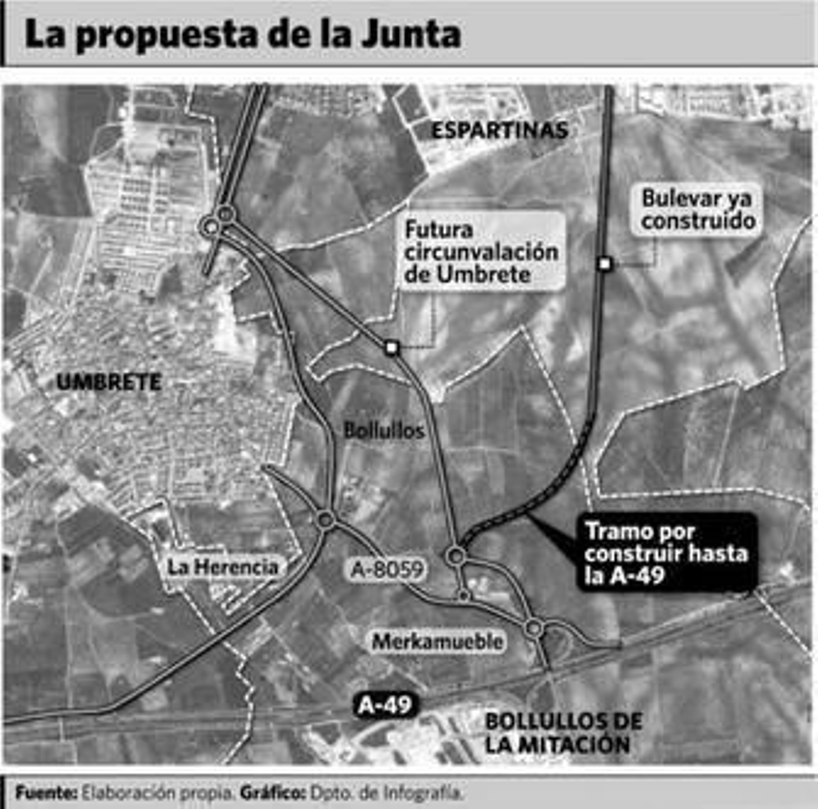 El Ayuntamiento tenía previsto financiar en solitario el bulevar que enlazaría con la A-49 por Bollullos, pero dice que el POTA lo ha dejado sin dinero · La Junta reitera que no paga viarios locales, como es el caso