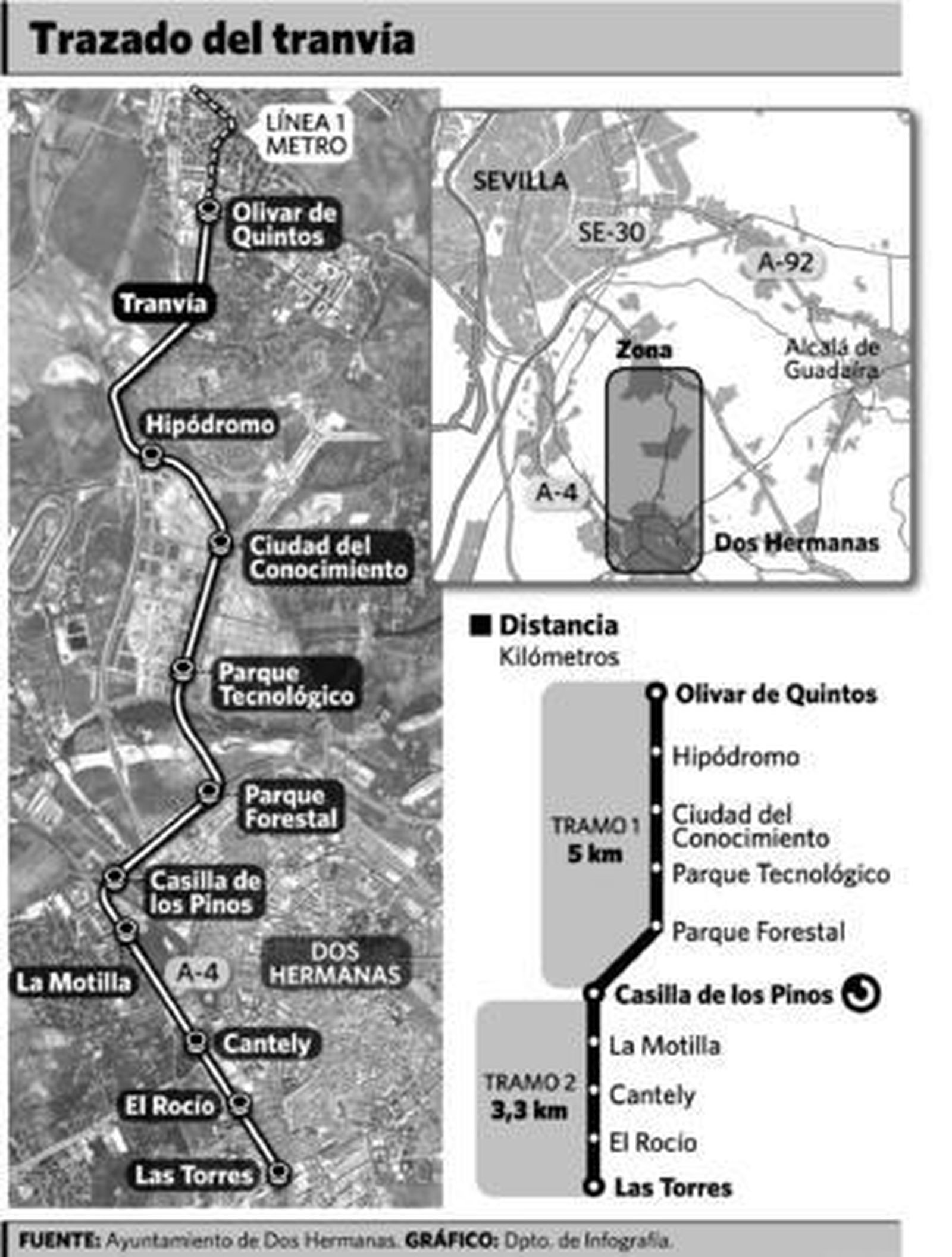 El coste total de la infraestructura tranviaria de Dos Hermanas asciende a 56,4 millones de euros en sus dos tramos, una cantidad que autorizó a principios de 2010 el Consejo de Gobierno de la Junta, pero de poco ha valido con los recortes presupuestarios por la crisis.