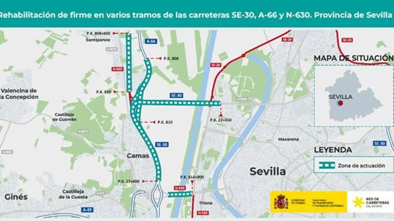 En horario de 21.00 a 6.00 horas, se producirá el corte parcial de dicha carretera nacional, permitiendo el paso en sentido alternativo de los vehículos. Durante tales afectaciones se llevarán a cabo los trabajos de fresado y extendido de aglomerado, ocupando un carril de la calzada y ordenando el tráfico en sentido alternativo por el otro carril de la calzada. Estos trabajos se enmarcan en una actuación global de rehabilitación del firme en varios tramos de carretera del entorno metropolitano de Sevilla, en concreto: SE-30, entre los kilómetros 17,600 y 22,450, A-66, entre los km 808 y 810 y N-630, entre los km 808,600 y 810; y entre los km 813,1 y 814,9.