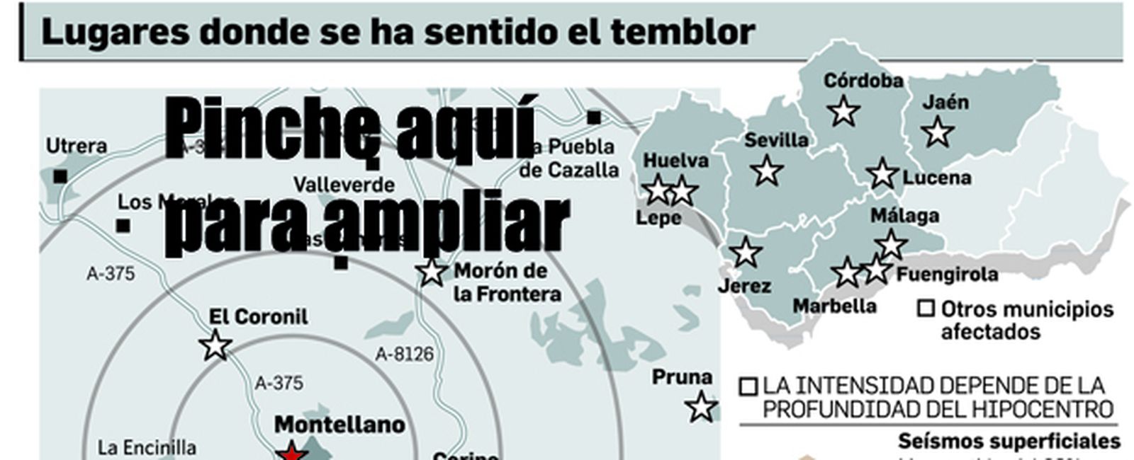 La tierra se ha movido. Sin duda, fueron muchos los sevillanos quienes a primera hora de la tarde comentaron el fenómeno a los pocos segundos de producirse. En concreto, las vibraciones sísmicas alcanzaron a doce localidades de la provincia y a buena parte de la ciudad. Los municipios en los que se sintió el terremoto fueron Alcalá del Río, Burguillos, Camas, Coripe, Dos Hermanas, El Coronil, Lora del Río, Mairena del Aljarafe, Montellano, Morón de la Frontera, Pruna y Sevilla. Además, el temblor también alcanzó en la provincia onubense a la propia capital y a las localidades de Cartaya y Lepe. En Cádiz se sintió en Algodonales, El Bosque, Jerez de la Frontera, Prado del Rey, Olvera, Puerto Serrano, Ubrique y Villamartín. Aparte de la capital, en Málaga llegaron las vibraciones a Estepona, Fuengirola y Marbella, mientras que en Córdoba se vieron afectados la capital y Lucena, y en Jaén, la propia ciudad.