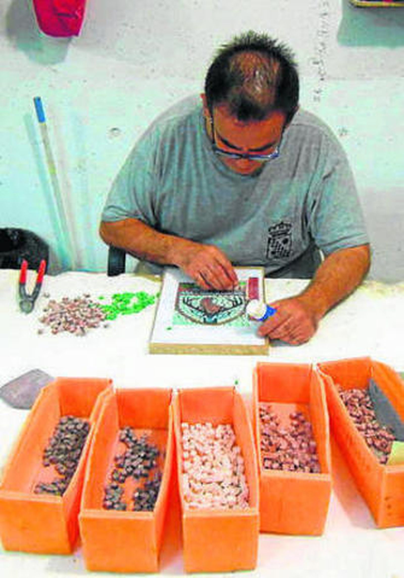 Domingo Romero es el monitor de dicho Centro Especial de Empleo. Él es el jefe de taller de mosaicos que, con paciencia, hace de los chavales unos expertos en teselas. "Afortunadamente las piezas están teniendo salida. Ahora por ejemplo estamos haciendo una fuente para Algámitas, rótulos para calles, o los trofeos de la Asociación Andaluza de Caza...", cuenta Domingo.