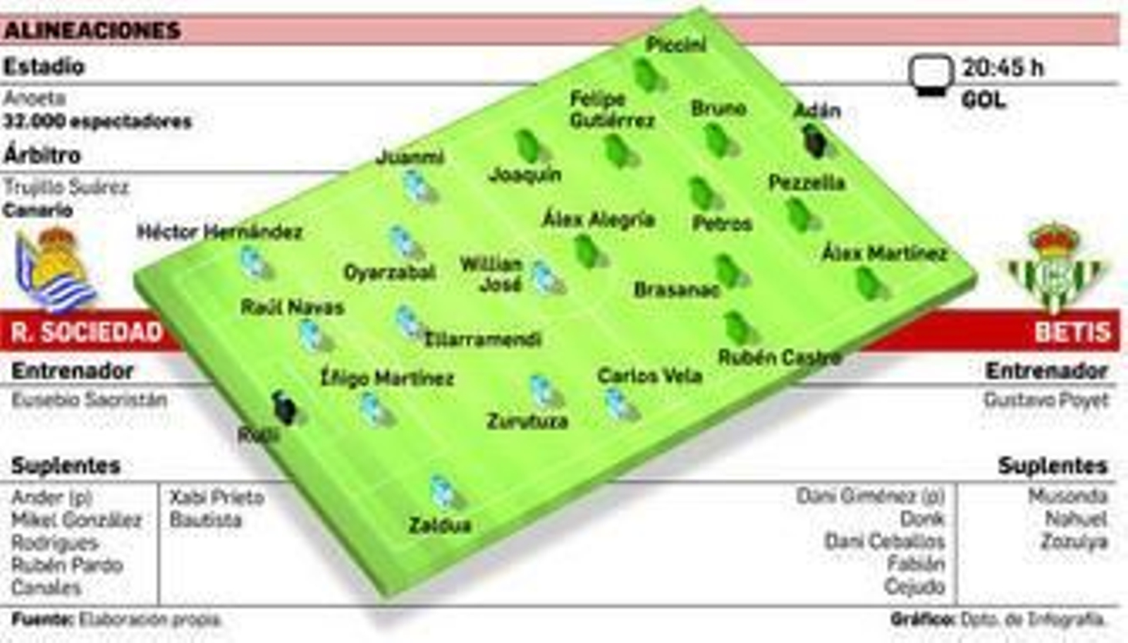 Además, el Betis no debe perder de vista a otros futbolistas ofensivos del equipo guipuzcoano, como Xabi Prieto, Carlos Vela y Juanmi, que se mueven con libertad absoluta por detrás de Willian José, y aprovechar, sobre todo, el buen momento por el que atraviesan Joaquín, Rubén Castro y Álex Alegría para hacerle daño a un rival que en su estadio sólo ha ganado un partido (4-1 a Las Palmas), empatado otro (1-1 frente al Espanyol) y cosechado una derrota (0-3 ante el Real Madrid), en lo que va de Liga.