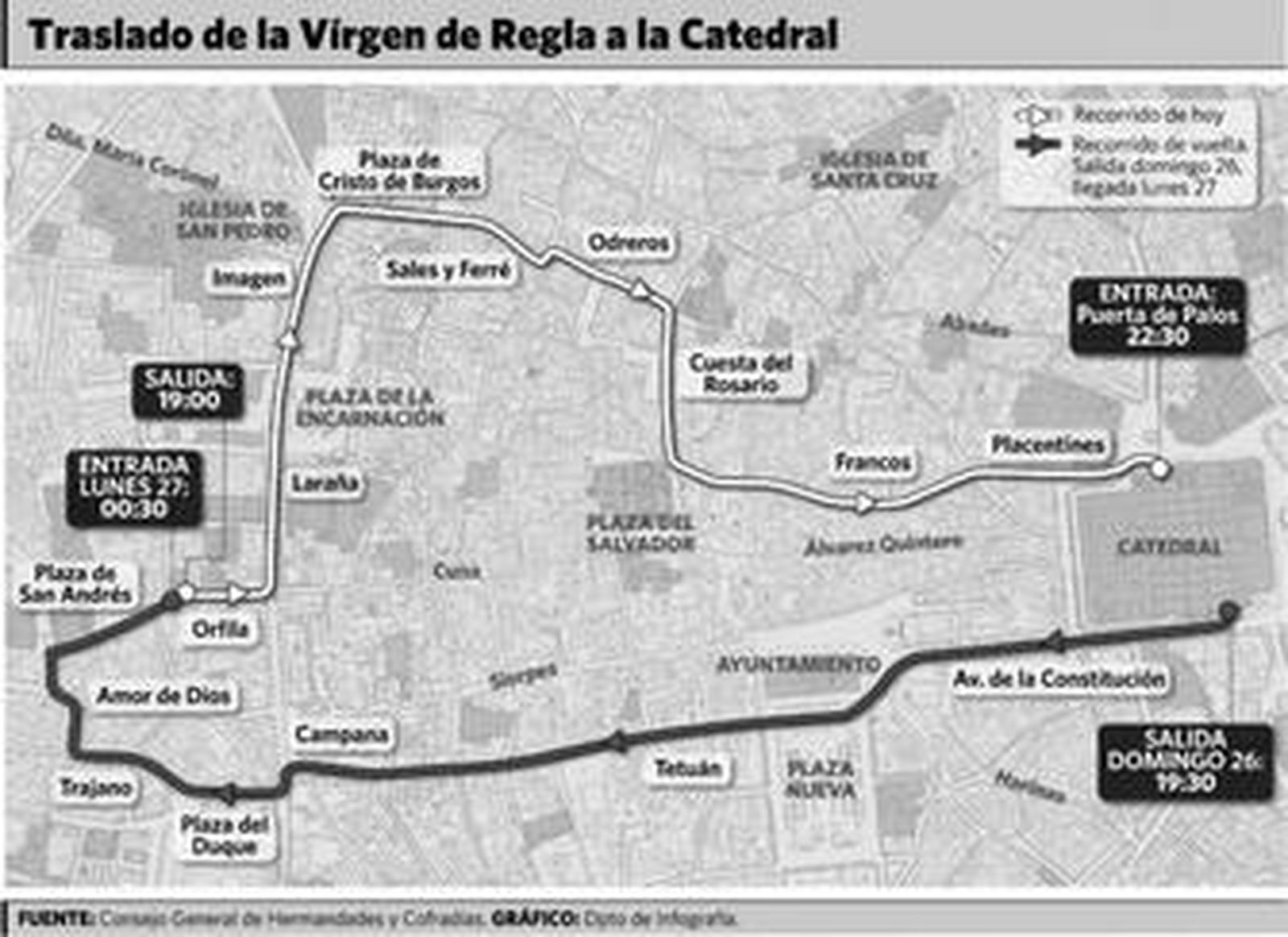 La Virgen de Regla de los Panaderos sale esta tarde camino de la Catedral, donde desde mañana se celebrará el triduo · El manto y la corona son los grandes estrenos