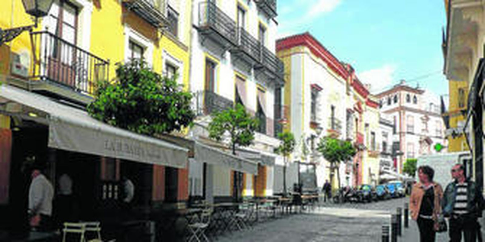 Pero su mención aquí viene dada por la importancia que tiene en la Semana Santa desde el Domingo de Ramos al de Resurrección sin que ni un solo día dejen de pasar cofradías por ella. Y en ella, colmada de establecimientos gastronómicos, tuvo relevancia la tertulia que en un entresuelo presidía el gran José Antonio Garmendia y que se llamaba Caseta Dolorosa en un ingenioso guiño a las dos fiestas principales de Sevilla.