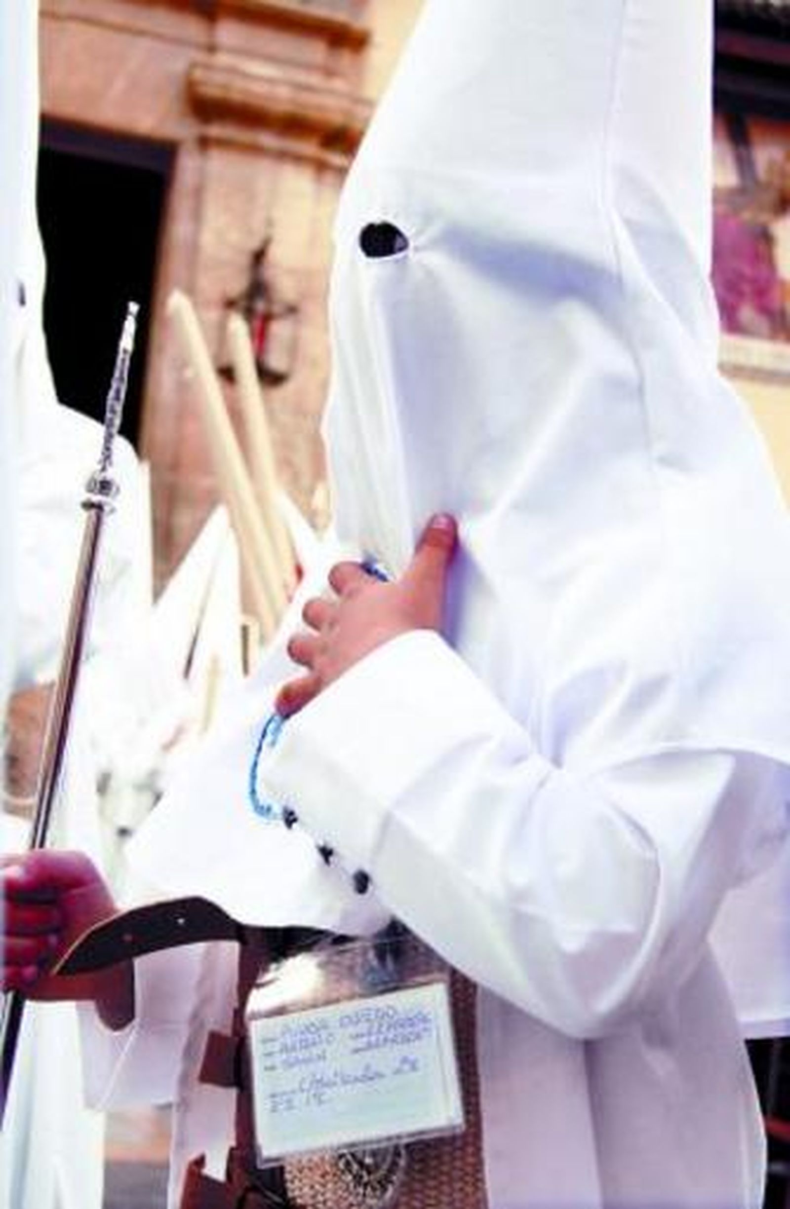 La pequeña comienza a hacer gestos con sus pequeñas manos en el momento en que se perciben en la plaza las primeras notas interpretadas por la banda de las Tres Caídas. Con algo de adelanto, comienza a salir la cofradía, que junta mucho las parejas de nazarenos. Las manos delatan la abundante presencia de niños y mujeres entre los blancos penitentes de la corporación.