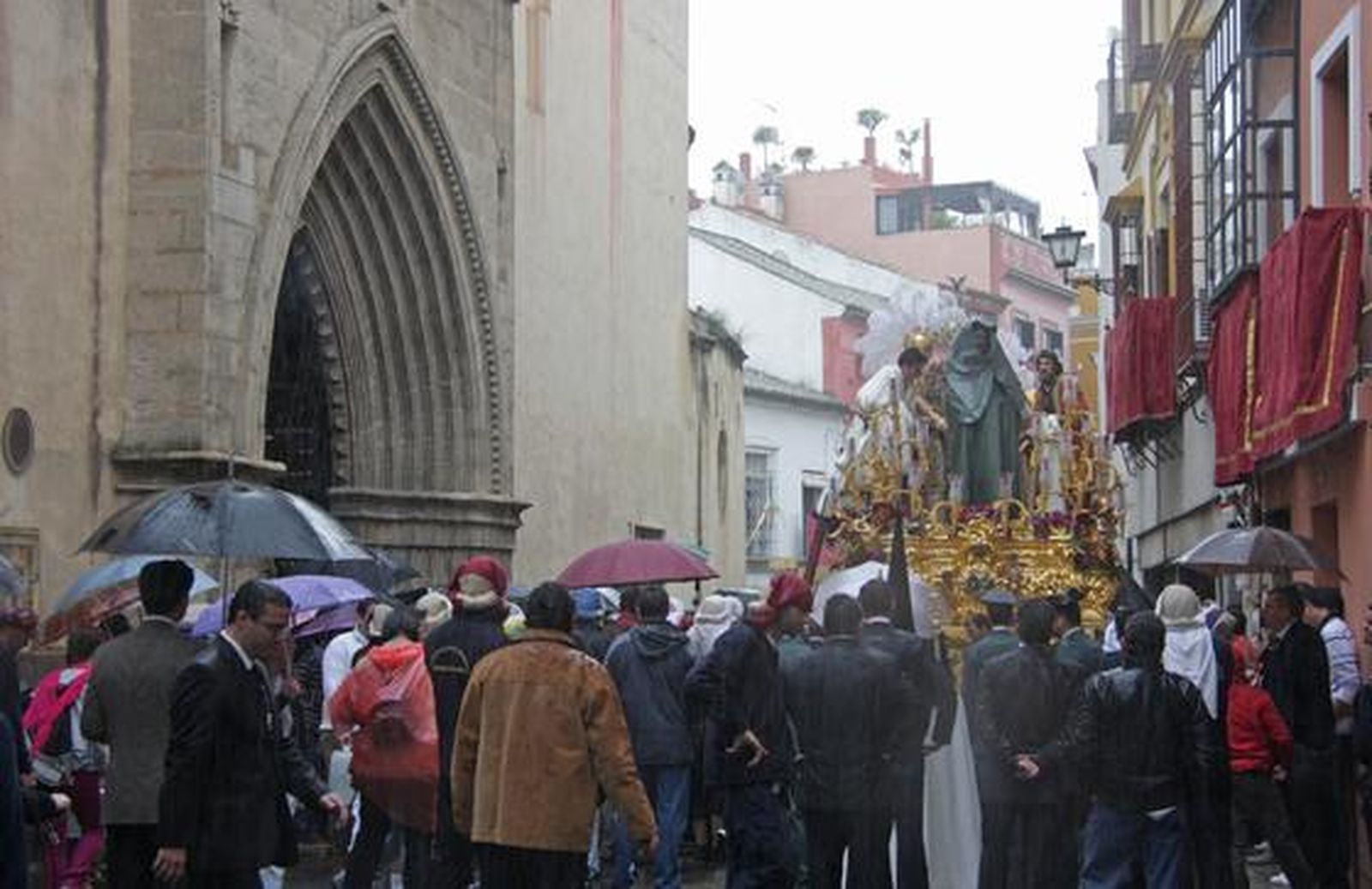 "En San Benito no cabe y en San Esteban se hizo una medida de urgencia y tampoco", decían en la hermandad. Y la iglesia de la Redención bastante tenía con acoger a los nazarenos, muchos de ellos niños, que acudían a protegerse del chaparrón en el momento de mayor tenacidad. La lluvia apareció a la altura de los caños de Carmona.
