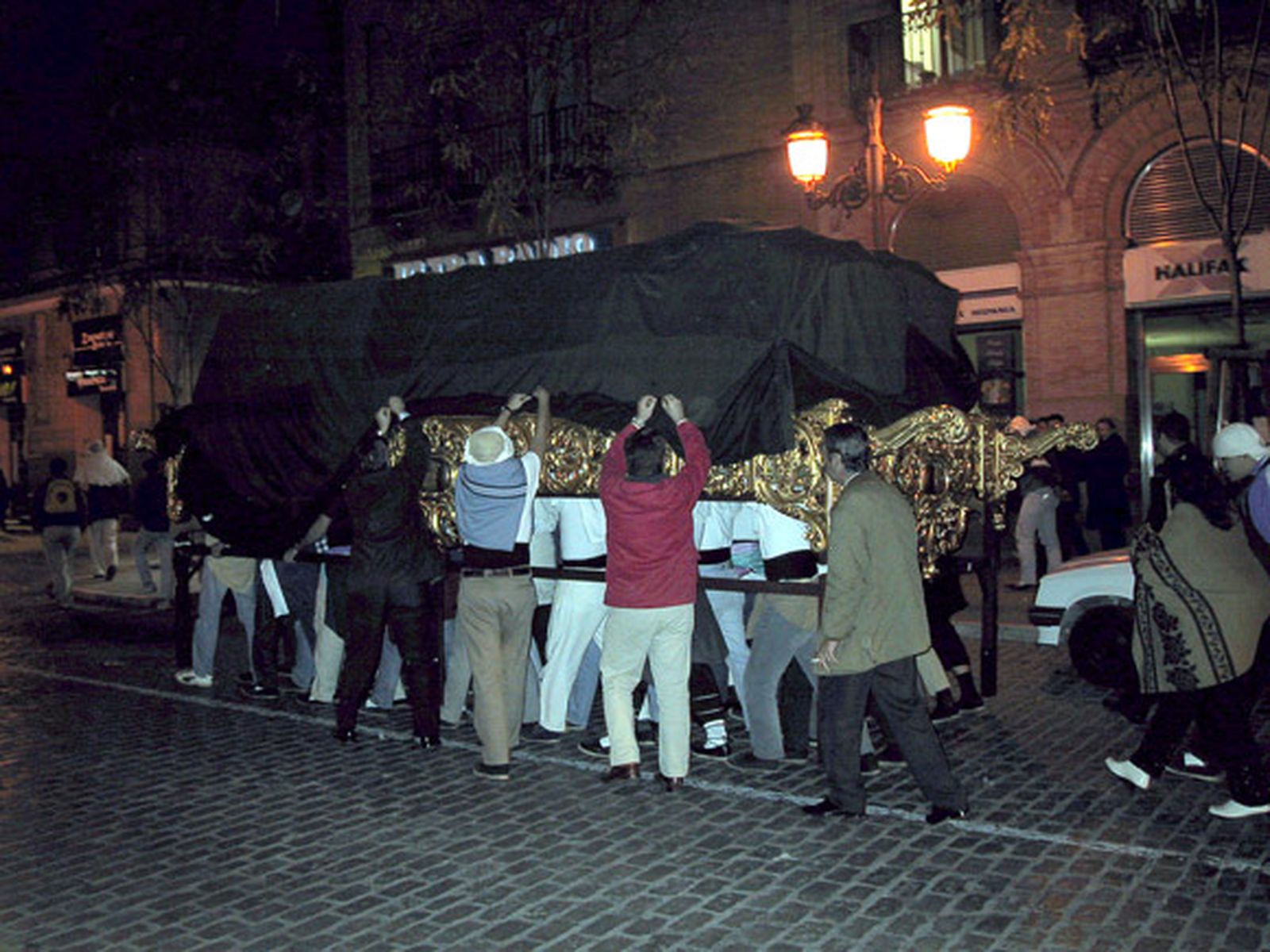 A deshoras de la noche van estos hombres por Sevilla. No son los únicos. Bajo lonas que cubren brillos dorados su costal empieza a calentarse cuando el frío arrecia por las calles con poca gente, pero con cierto público.