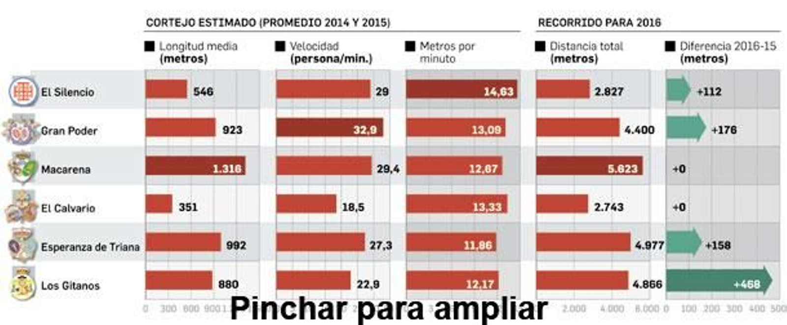 Incidencia. Los cambios descritos suponen una modificación de la longitud de los recorridos de un 4% o inferior para el Gran Poder, la Esperanza de Triana y el Silencio; y de un 10% para los Gitanos. El Gran Poder llegaría al nuevo punto de cruce con la Esperanza de Triana (Gravina con Canalejas) mucho antes de que la cofradía trianera inicie su recorrido por la carrera oficial. Si este cortejo quisiera dejar paso al Gran Poder, debería comprimirse hasta unos 530 metros, la mitad de su tamaño estimado al paso por la carrera oficial. Además, cualquier incremento sustancial en la participación del número de nazarenos en la Macarena, el Calvario o la Esperanza de Triana que implicara un aumento en el tiempo de paso agravaría esta situación.
