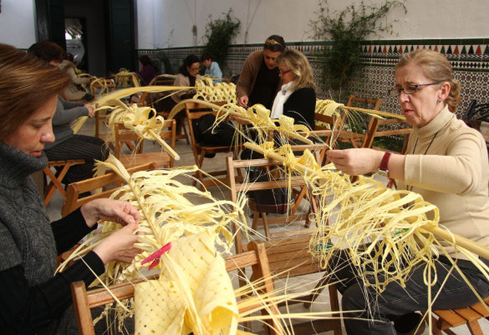 Una de las coordinadoras de estos talleres es Esther Ortego, la también consejera de las hermandades de Gloria del Consejo de Hermandades y Cofradías de Sevilla, que aprendió hace nueve años de la mano de Juan Ortega. Fue ella y su taller de amigas las que introdujeron en Sevilla la palma rizada, en primer lugar, en la Borriquita, proveniente del levante español. El origen de la palma en España está en Elche, en las palmas blancas ilicitanas, de donde surten a toda la península previo encaperuzado, que consiste en atar las ramas para ocultarlas del sol y que pierdan la clorofila para darles ese color amarillento. Tras esto, la recogida del palmeral, su limpieza mediante el cepillado, el lavado en balsas. Después de este proceso de preparación, están listas para ser tratadas y rizadas.