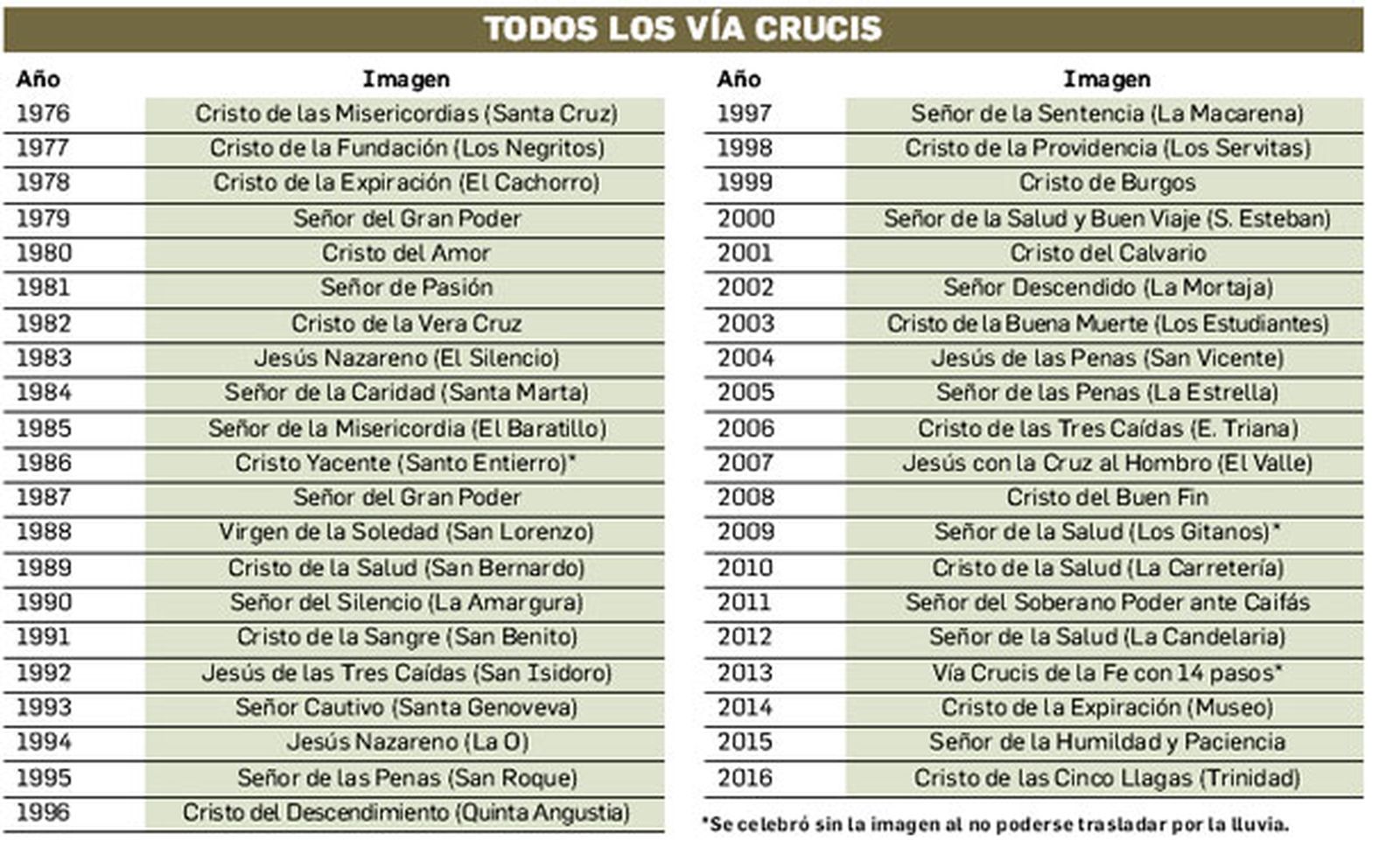 La única jornada en la que se han elegido a todos sus titulares para presidir el Vía Crucis es la Madrugada, aunque el Señor de la Salud de los Gitanos no pudo trasladarse a la Catedral en el año 2009 al impedirlo la lluvia que apareció con fuerza durante el primer lunes de cuaresma. Ésta es una de las circunstancias que se quiere cambiar. Es muy posible que en los próximos años el Nazareno de los Gitanos sea elegido de nuevo. El Lunes Santo es el segundo día en participación. Han presidido el rezo en la Catedral las imágenes del Cristo de la Expiración del Museo, el de la Vera Cruz, el Señor de la Caridad (Santa Marta), el Cautivo de Santa Genoveva, el Señor de las Penas (San Vicente) y el Señor del Soberano Poder ante Caifás (San Gonzalo). El Domingo de Ramos, el Martes Santo, el Viernes Santo y ahora el Jueves Santo, con cinco imágenes, son los siguientes días que más veces han sido elegidos.