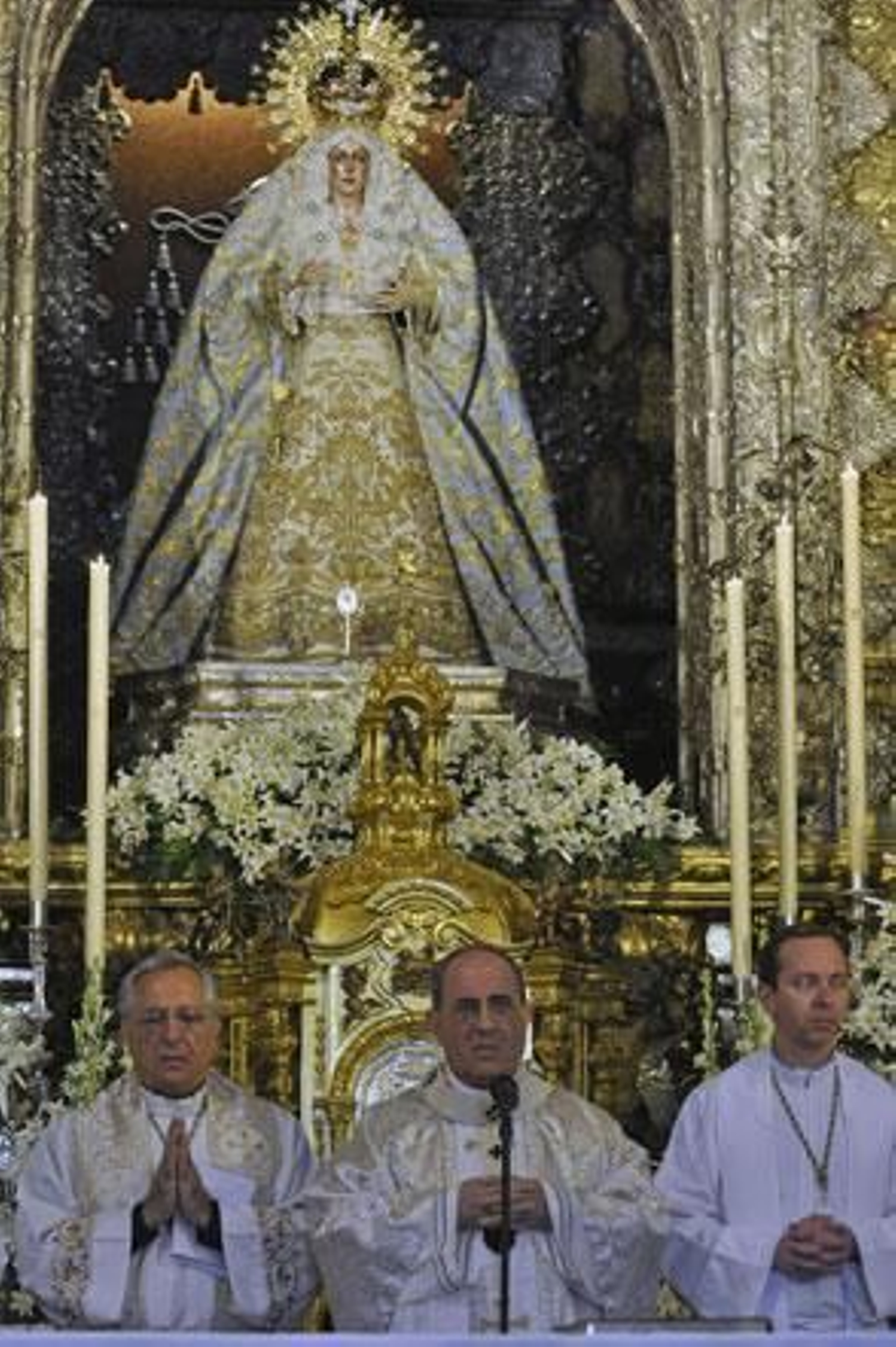 En su homilía, monseñor Asenjo espetó a los fieles que abarrotaban el templo a volver la mirada a la Virgen en este tiempo jubilar en el que la Iglesia también celebra el Año de la Fe: "Nuestro encuentro con Cristo debe ser el objetivo último". El prelado puso de manifiesto el contexto de "profunda crisis de fe" que vive la sociedad actual y el "eclipse de Dios" con el que viven los españoles: "Vivimos en una especie de apostasía silenciosa, en una desertización espiritual. Como si Dios no existiera. Es el gran ausente. La Religión ocupa uno de los últimos lugares en la escala de valores. El hombre ha dado paso a las religiones civiles como la ecología, el deporte o el culto al cuerpo. No es normal este olvido de Dios. Ése es el origen de los problemas de la sociedad. La crisis económica tiene profundas raíces morales".