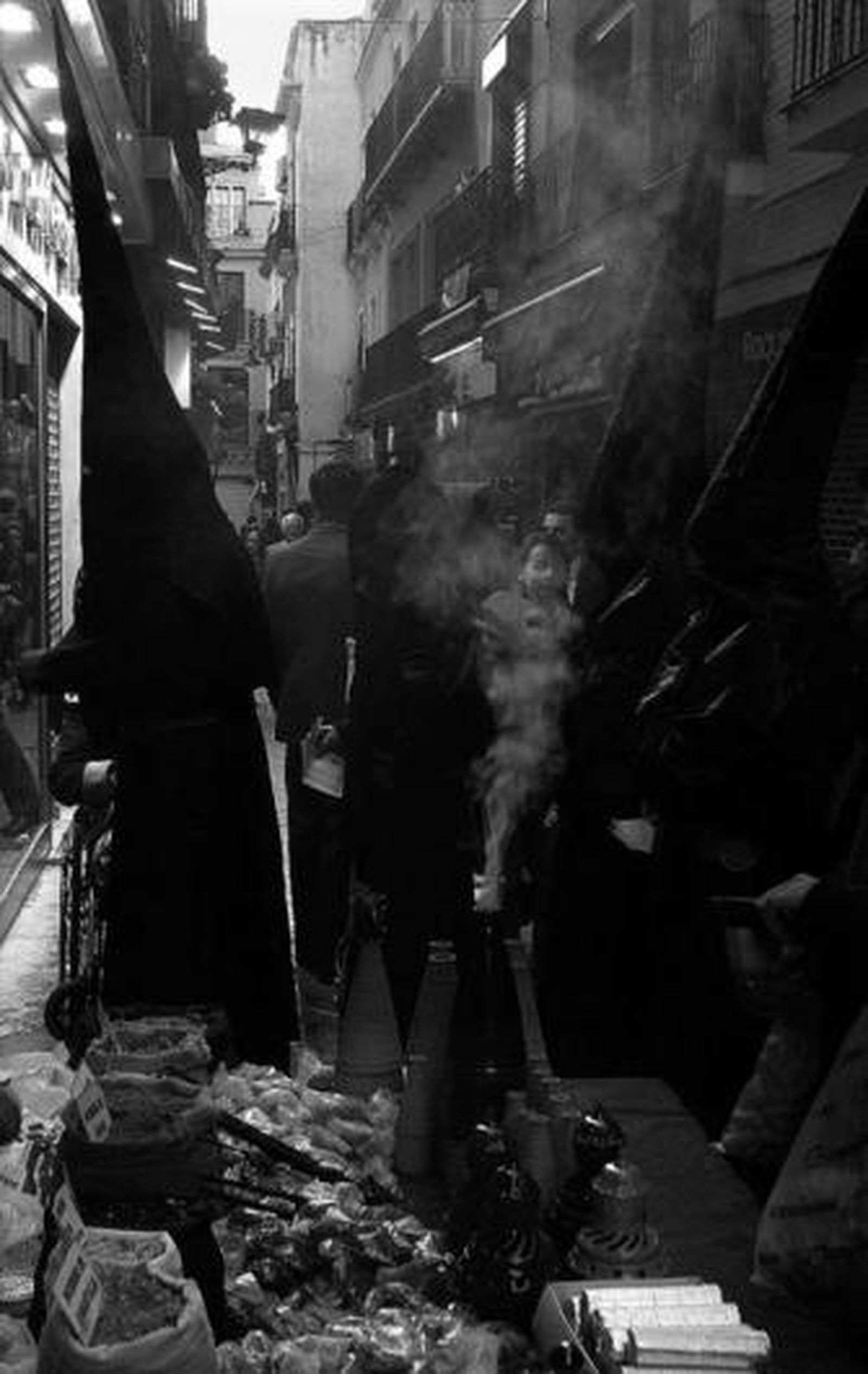 En ese momento una mujer abrió unos centímetros la valla que acotaba el espacio para la salida de la hermandad y se arrodilló. Se quedó quieta y cabizbaja en una esquina junto a las vallas. Un policía de la unidad de antidisturbios que abría paso al cortejo la miró, extrañado, pero decidió no decirle nada. La mujer, muy discreta, no molestaba a los nazarenos ni al público que tenía detrás. Con un pañuelo hecho un guiñapo se limpiaba las lágrimas. Se colocó junto a un reportero japonés que esperaba el momento para grabarlo con su cámara Panasonic y que la miraba aún más sorprendido que el policía.