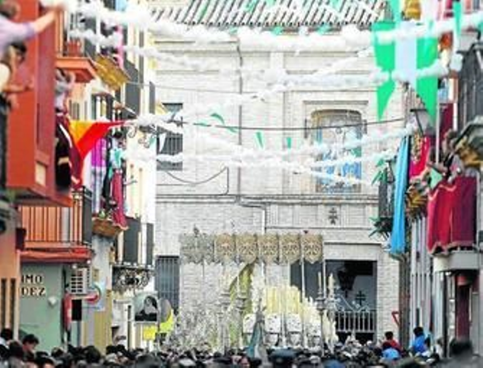 La mañana trajo la buena nueva de no contar en Velázquez con una pancarta en la que el viernes se mencionaba una advocación gloriosa de la provincia y cuya presencia carecía del más elemental de los sentidos. La cordura siempre es bien recibida. En la calle Santa Ángela de la Cruz se daban los últimos retoques. El bordador José Antonio Grande de León, con ayuda de Pedro Luis Bazán, colocaba los últimos adornos en el bloque de pisos situado junto al convento de las Hermanas de la Cruz. Una quincena de mantones de manila a los que acompañaban reposteros, guadabrisas y un gran cuadro de la Macarena. Estampa similar que se repetía en balcones de Feria y en Parras, epicentro macareno con esa estética que resurge cada cuarto de siglo cuando mayo cuenta sus últimos días: cadenetas de flores que cruzaban la calle de azotea a azotea y pequeños altares donde imperaba el ingenio de los vecinos. No obstante, hay quien, como el experto en tradiciones sevillanas Julio Domínguez Arjona, considera que dichos exornos son más propios de ciertas localidades de la provincia y no de la capital. Cuestión de gustos. Y de criterio.