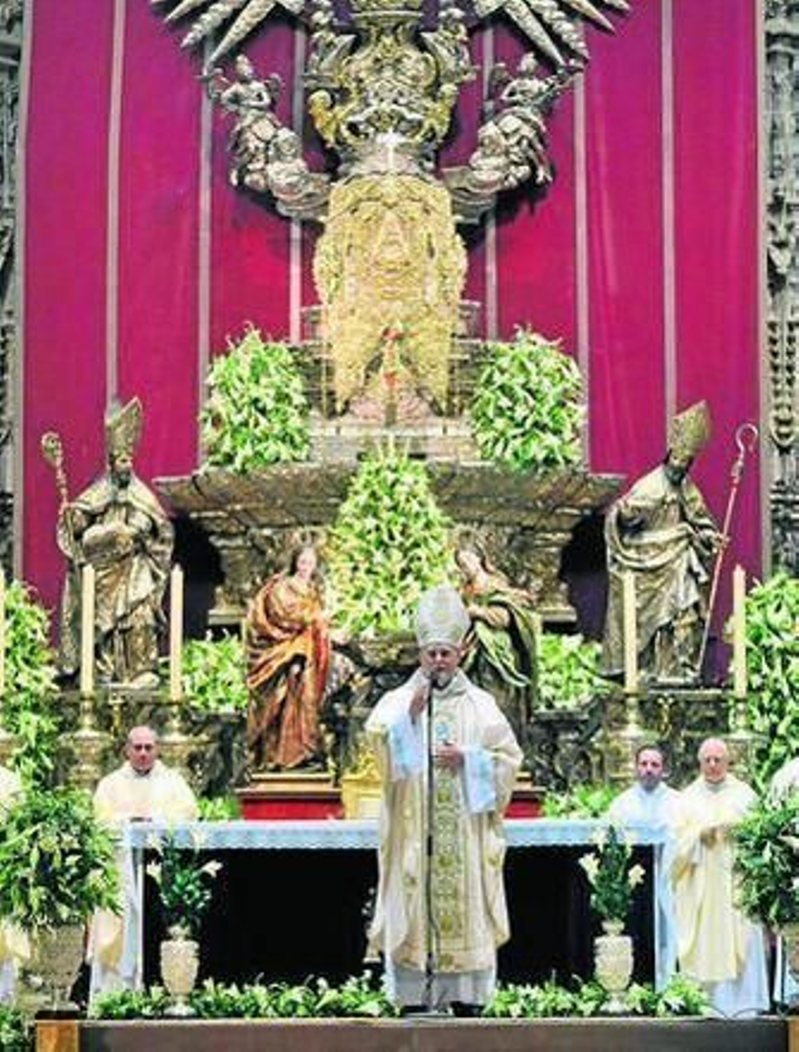 La misa estacional que tuvo lugar por la mañana puso el broche de oro a los cultos celebrados en la Catedral. "Camino del Rocío fui sin saber a dónde iba. Tú, Señora, me abriste los brazos, y mi noche se convirtió en mediodía". Con la letra de esta canción, que repitió varias veces, comenzó su homilía el cardenal Amigo Vallejo. El arzobispo emérito de Sevilla recordó a los hermanos del Rocío de Triana que el camino tiene un nombre y se llama Jesucristo, y que la fe debe ser la que corone esos senderos que recorren cada año: "No hay camino sin camino y Jesucristo es el camino, la verdad y la vida. No hay fe sin camino. Este camino del Rocío hay que vivirlo con fe. Porque sino sería un camino sin santuario. Sería caminar por caminar. Por eso es necesaria la fe".