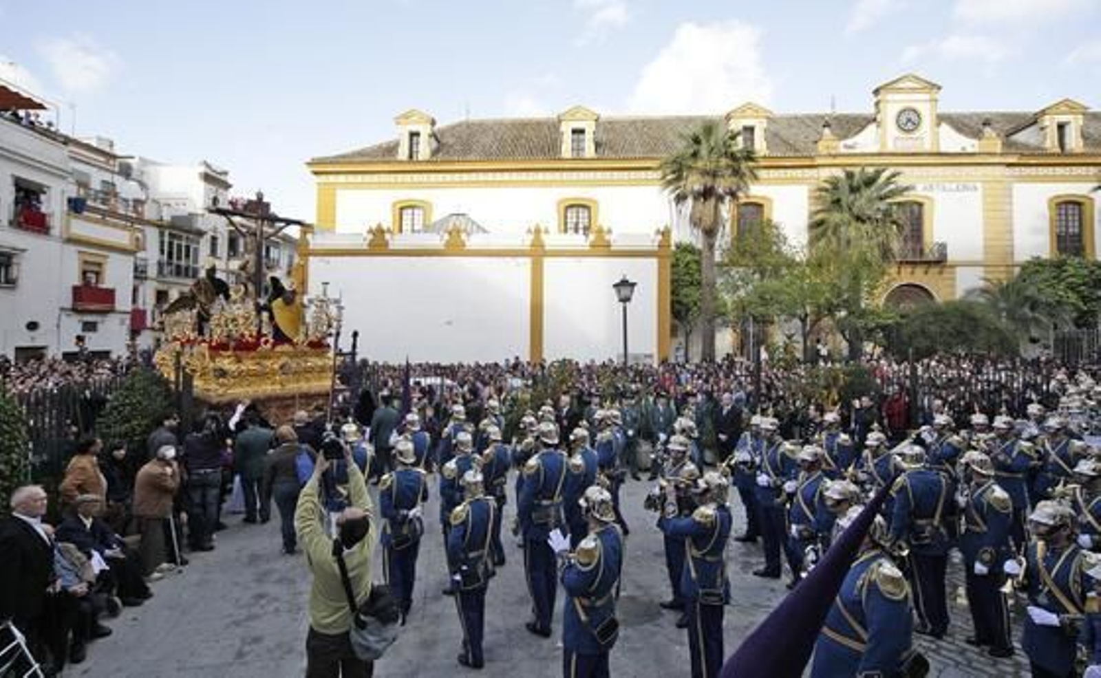 La tarde abría por fin en el Arenal en un Lunes Santo de bajas temperaturas. El mercurio por los suelos y los ánimos por las nubes. Se ponía el paso de misterio de las Aguas a la hora acostumbrada en el dintel de su capilla, situada en un enjambre de edificios que representan las tres edades arquitectónicas de la ciudad: La Era del Descubrimiento en las Atarazanas, donde se forma el cortejo de nazarenos; el Barroco en la Iglesia de San Jorge (La Caridad); y la herencia vanguardista de la Expo del 92 reflejada en el Teatro de la Maestranza.