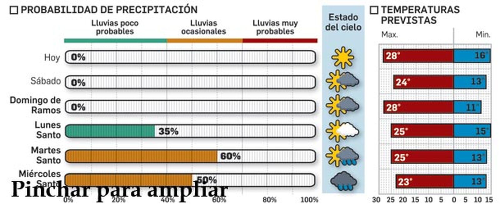 Por su parte, la página weather.com pronostica a día de hoy buen tiempo para el inicio de la Semana Santa, con una probabilidad nula de precipitaciones hasta el Martes Santo. Desde el Miércoles Santo, el porcentaje aumenta al 20% hasta situarse en el 30% el Viernes Santo.
